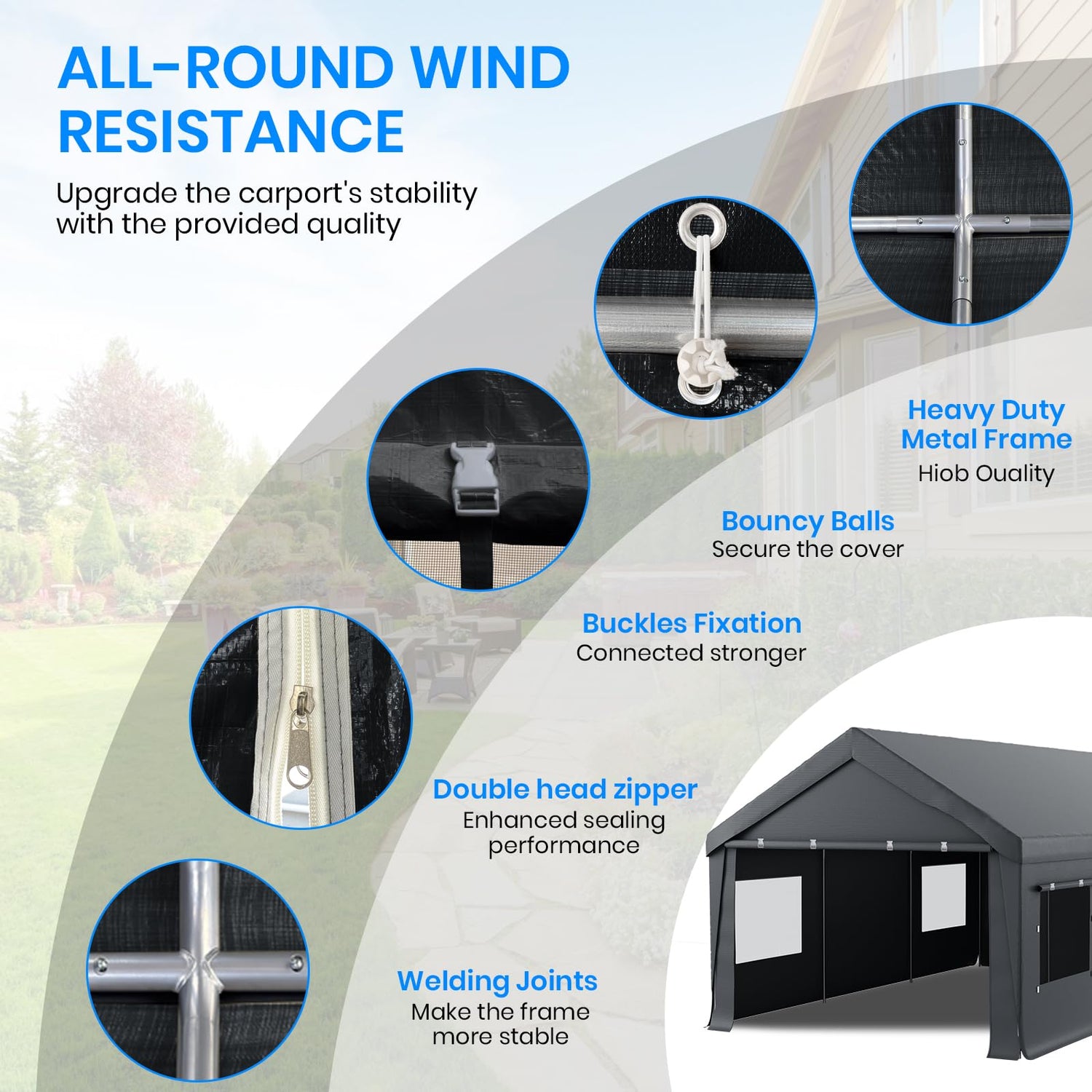 - 【Roll-Up Windows&Double Zipper Doors&Removable Side Wall】This carport shelter has 2 removable sidewalls with roll-up ventilation windows. You can open the side walls or windows for ventilation, or close them to provide excellent coverage against rain, snow, and sun. Double zipper roll-up doors, facilitate ventilation but also easy interior access