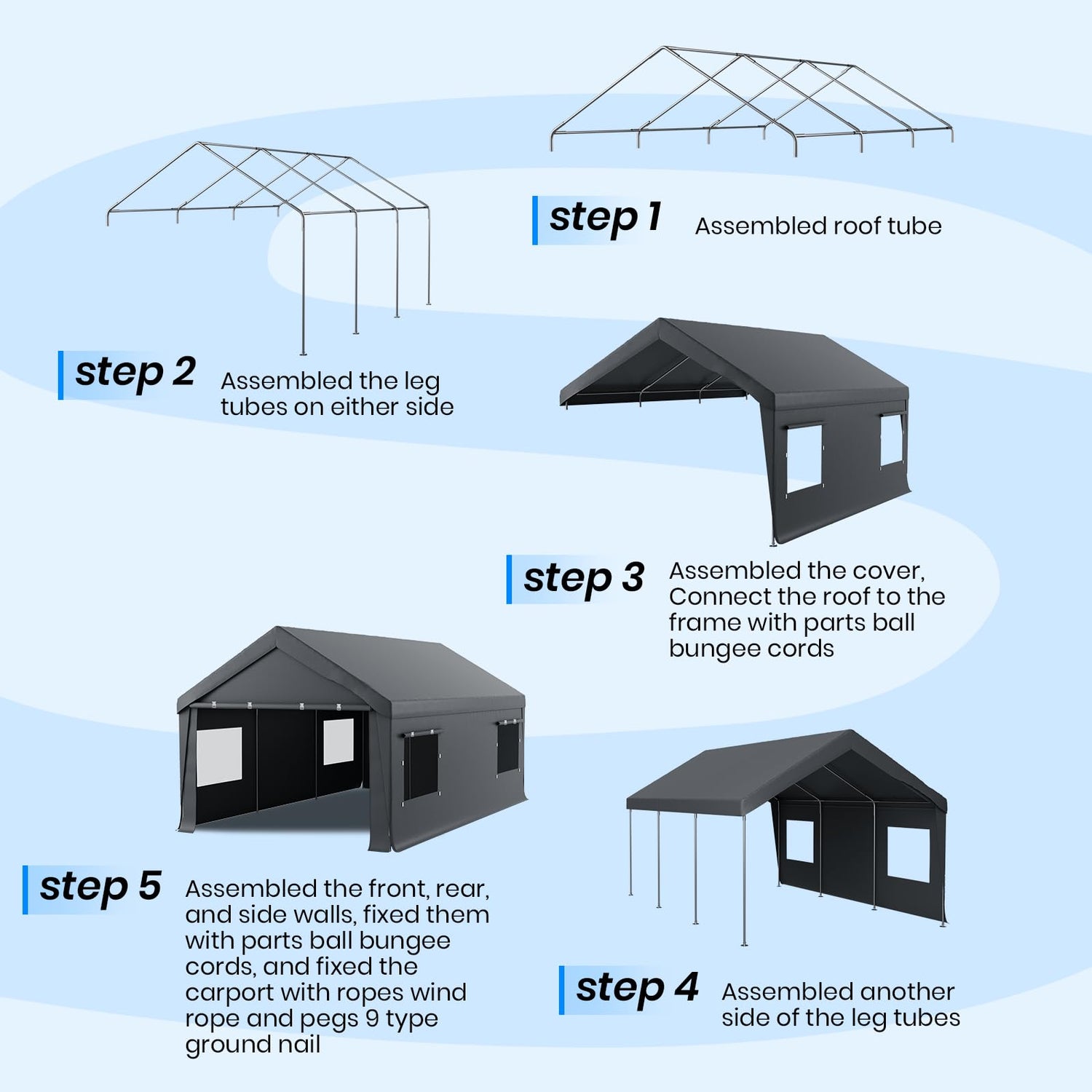 - 【Effortless Assembly】The portable garage 12x20 heavy duty is packed in cartons. Each component is numbered, and the included instructions provide clear, step-by-step guidance. Typically, two to three adults can complete the installation within a short time.