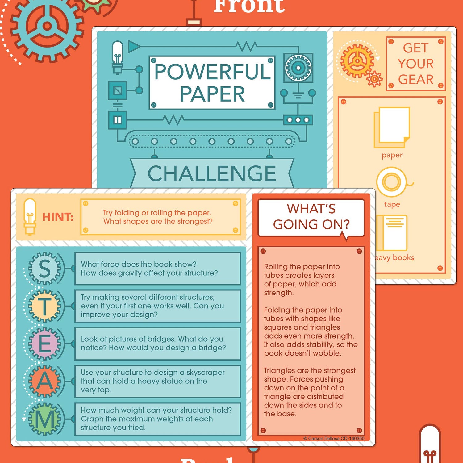 Details: Help students go full STEAM ahead with grab-and-go activities! STEM Challenges for grades 2-5 provides a fun way to enhance STEM learning in the classroom. This boxed set includes 30 full-color challenge cards that are designed to capture a student’s attention with diverse, simple, and easy to complete activities. These engaging cards cover essential science topics for young learners surrounding life, physical, and earth & space science. Each challenge card features two sides—the front side includes the challenge and a visual list of materials needed to complete the challenge. The back of the card is ideal for extended learning and includes hints, questions, and explanations of the science behind the challenge. Students will complete challenges where they create paper rockets, partake in fun science experiments, and more! Great for centers, hands-on classroom lessons, and homeschool learning fun. A divider is included to organize your cards with ease. Education happens everywhere, and Carson Dellosa strives to provide the tools needed to inspire learning everywhere it happens.