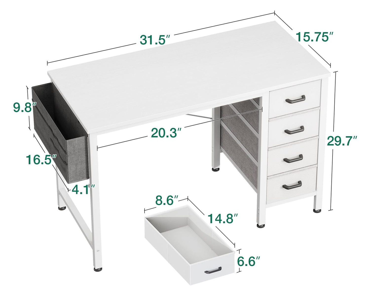 Casaottima 32 inch Small Computer Desk with 4 Fabric Drawers, Side Hook and Cloth Bag, Kids Study Table for Bedroom and Small Space, Pure White