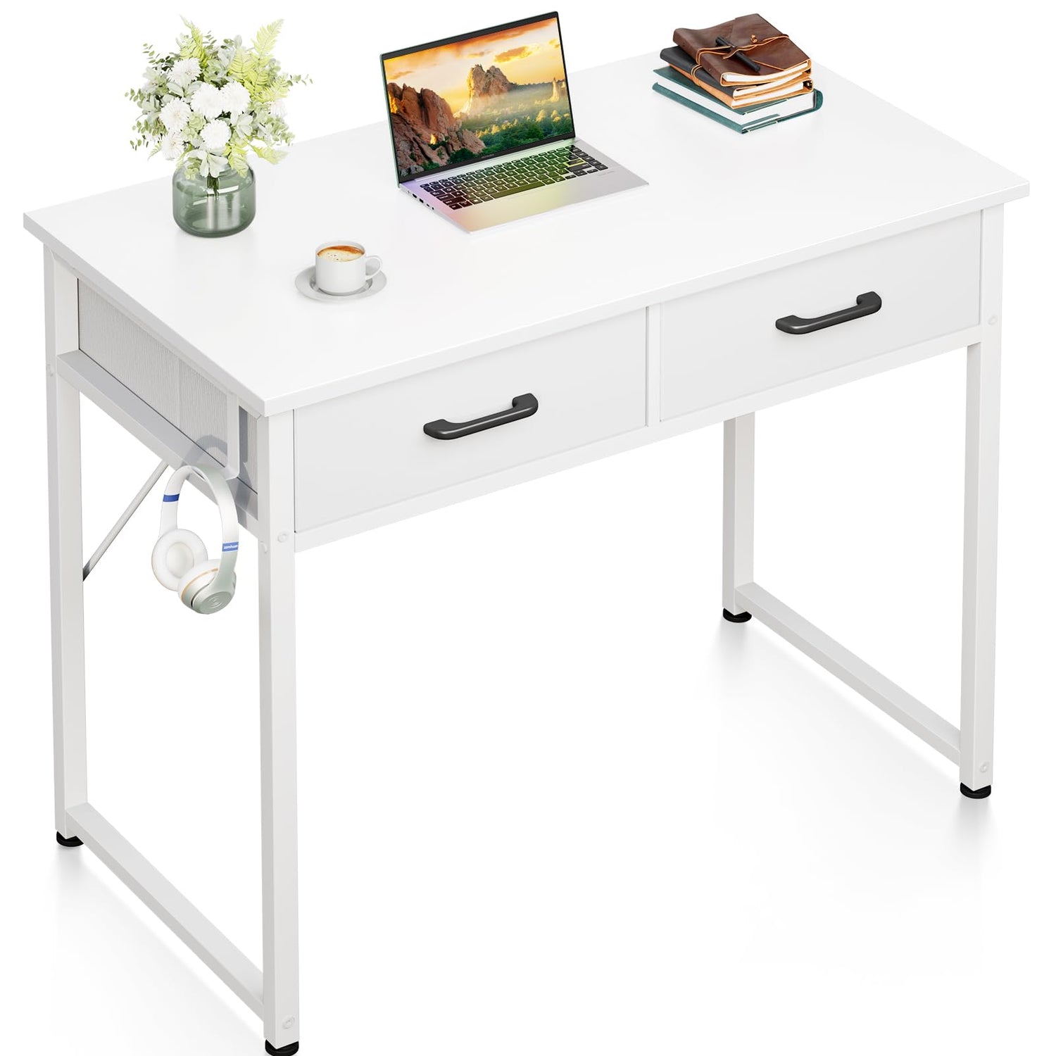 Casaottima 32 Inch Small Office Computer Desk with 2 Drawers & Headphone Hook - Compact Writing Desk for Home Office, Study or Work, Modern Space-Saving Design for Small Spaces, White