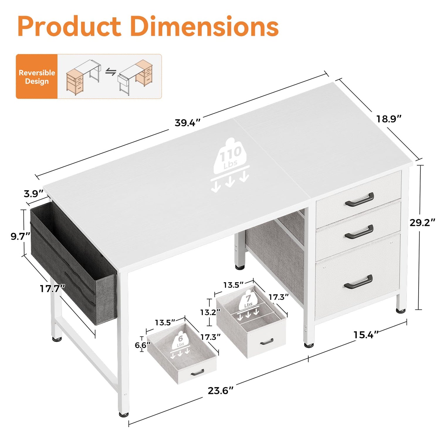 Casaottima 40-Inch Small Computer Desk with Fabric Drawers & File Cabinet, Home Office Desk with Cloth Storage Bag and Hook, Writing Study Work Table for Small Space, Vanity Desk for Bedroom, White