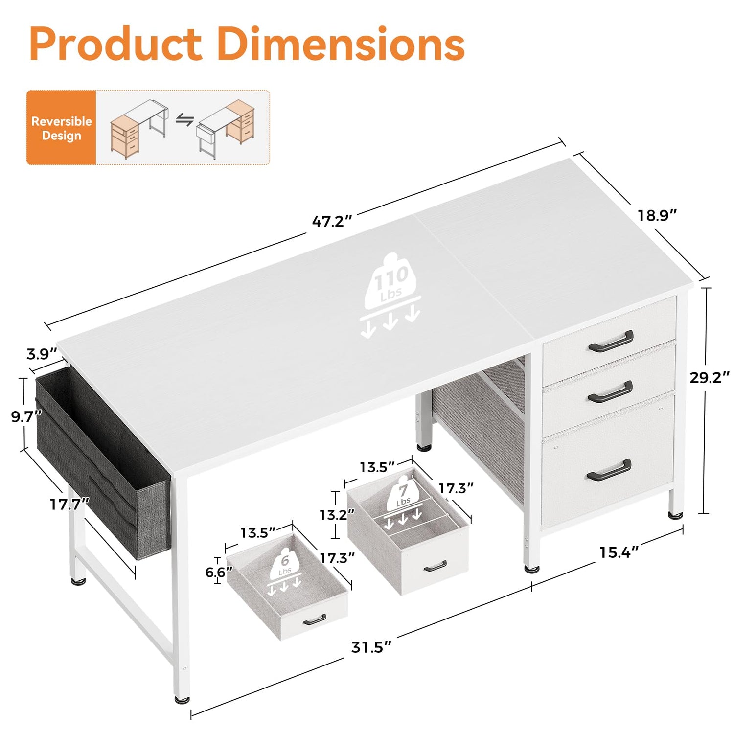 - 【Reversible Modern Desk】 the study desk features a reversible design. The drawer and file cabinet can be mounted on either the left or right side, so you can fit this desk to your needs in any room. Our elegantly designed desk fits to living rooms, bedrooms, offices, dorms, kids’rooms and more.