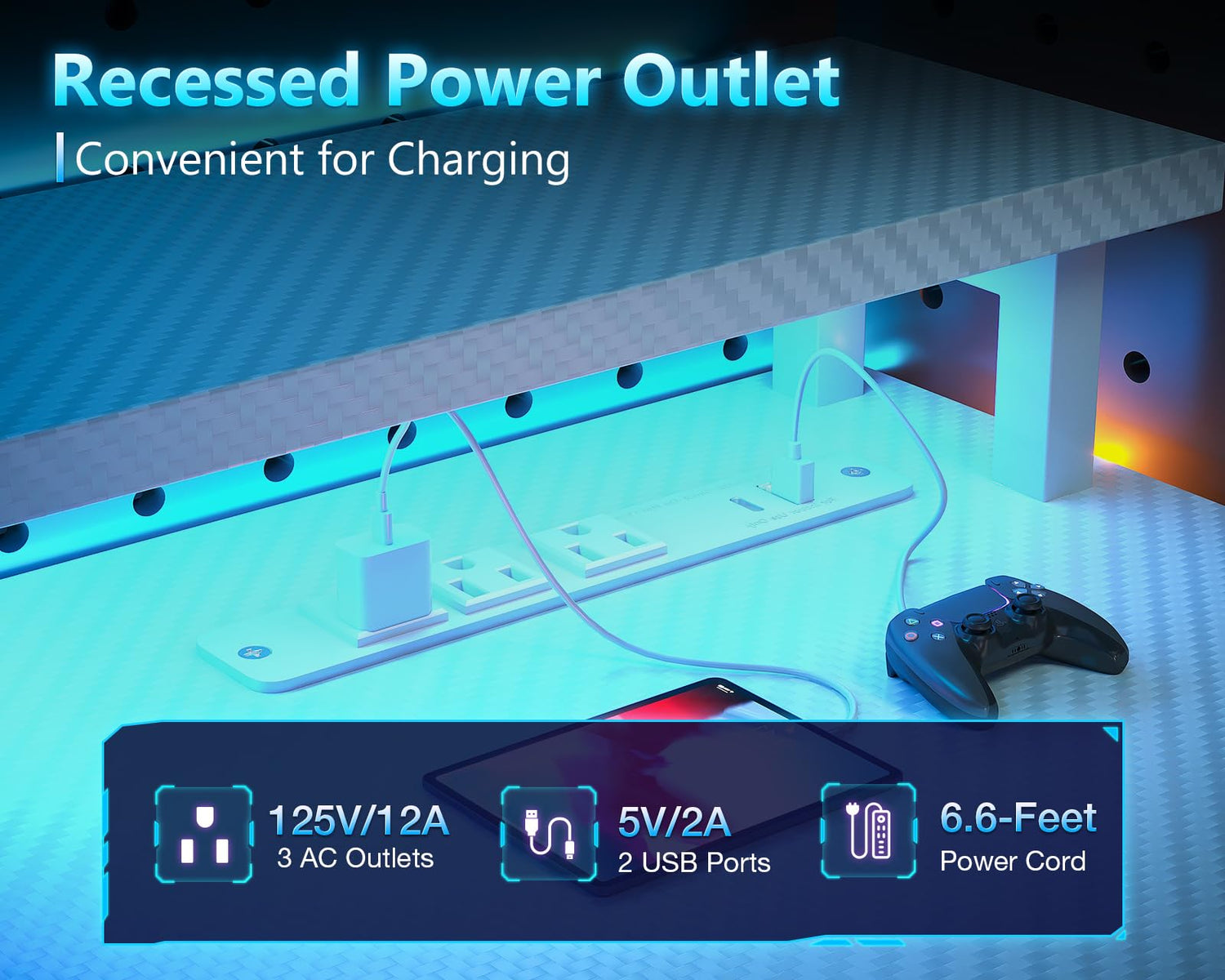 - 🔌 Stay Powered Up with USB Ports & Power Outlets. Never run out of battery again! This gaming computer desk comes equipped with 2 USB ports and 3 power outlets, allowing you to charge up to 5 devices simultaneously. Keep your smartphone, gaming gear, and other electronics powered up while you play, work, or study. The strategically placed power outlet and USB ports add convenience to your daily routine, ensuring your devices are always ready to go.