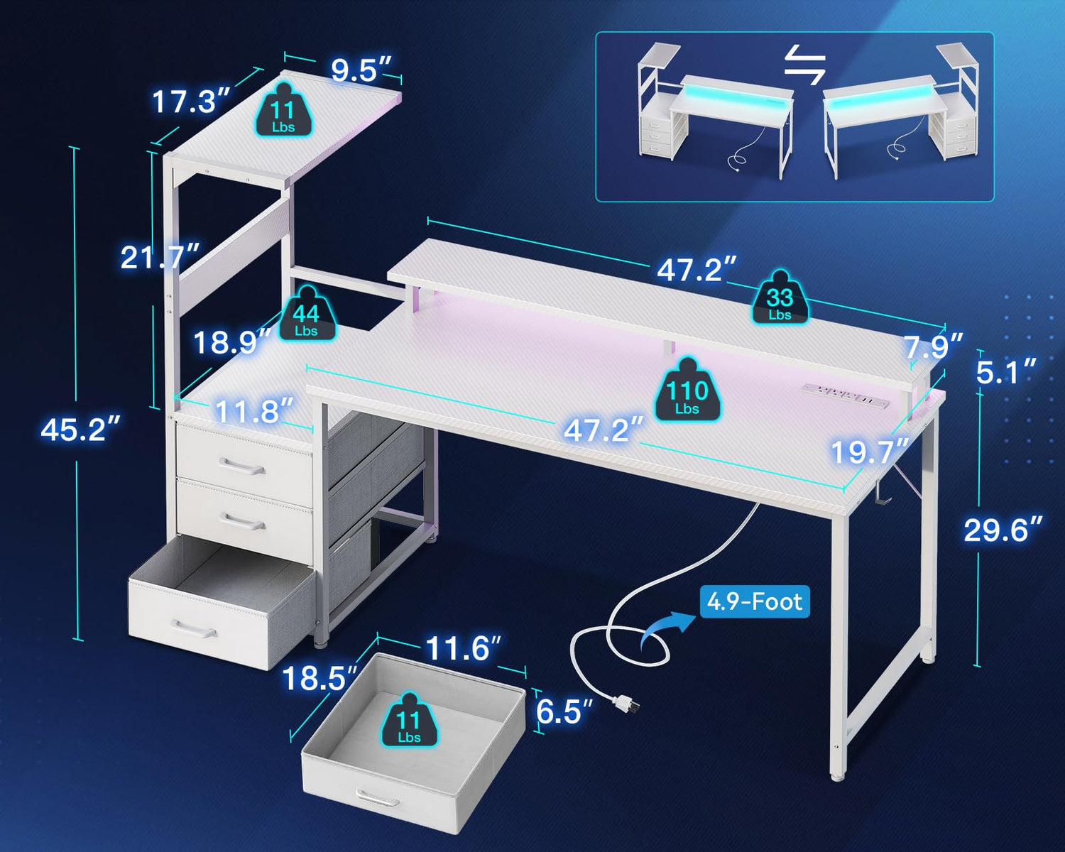 - 🗄️ Maximize Storage with 3 Drawers & Reversible Shelf. Stay organized with the Casaottima gaming desk, designed with 3 fabric drawers, a side hook, and a spacious open shelf. The 3 drawers provide ample space for your gaming accessories, while the reversible shelf can be installed on either the left or right side to suit your setup. Store your gaming PC, headphones, or Bluetooth speakers neatly and keep everything within reach. This desk is a game-changer for keeping your space clutter-free and functional.