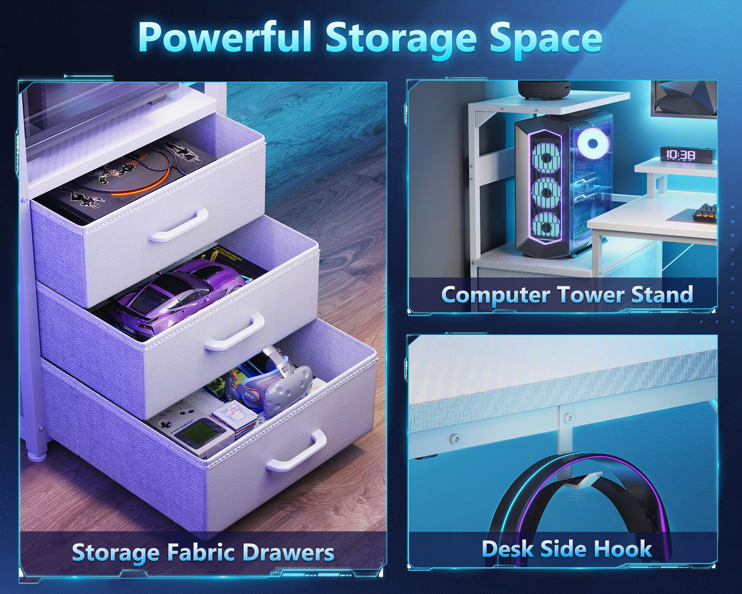 Casaottima 59 Inch Gaming Desk with USB Charging Ports & LED Light - Reversible Computer Desk with 3 Fabric Drawers, Monitor Stand, CPU Stand, and Side Hook, Modern Office Desk, White