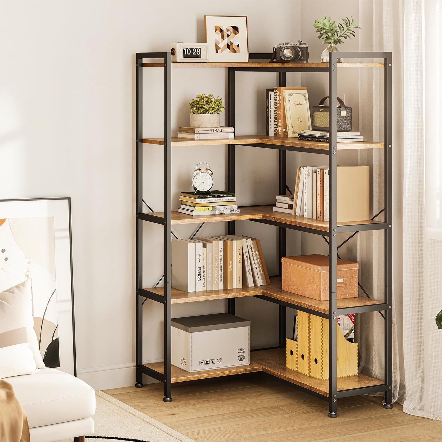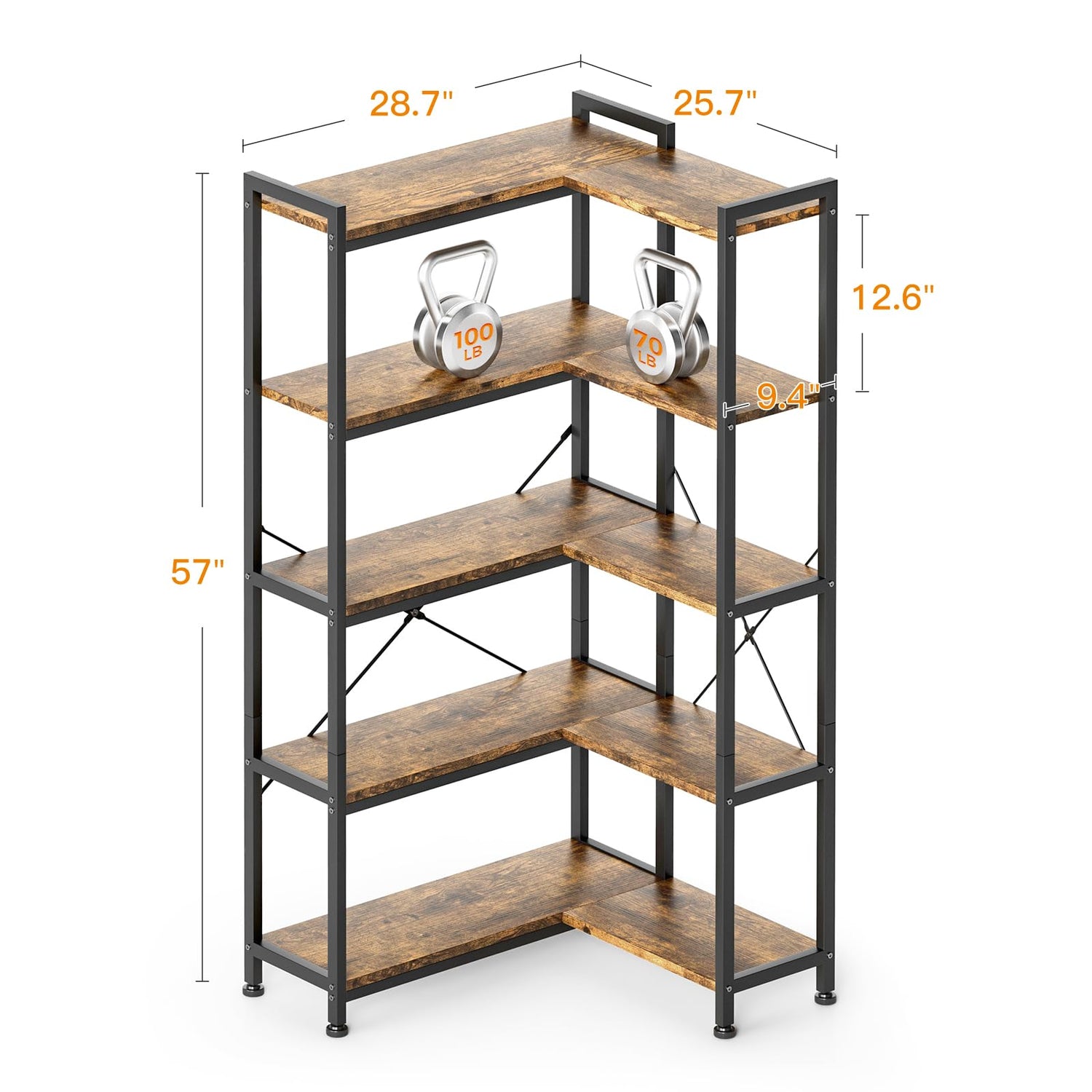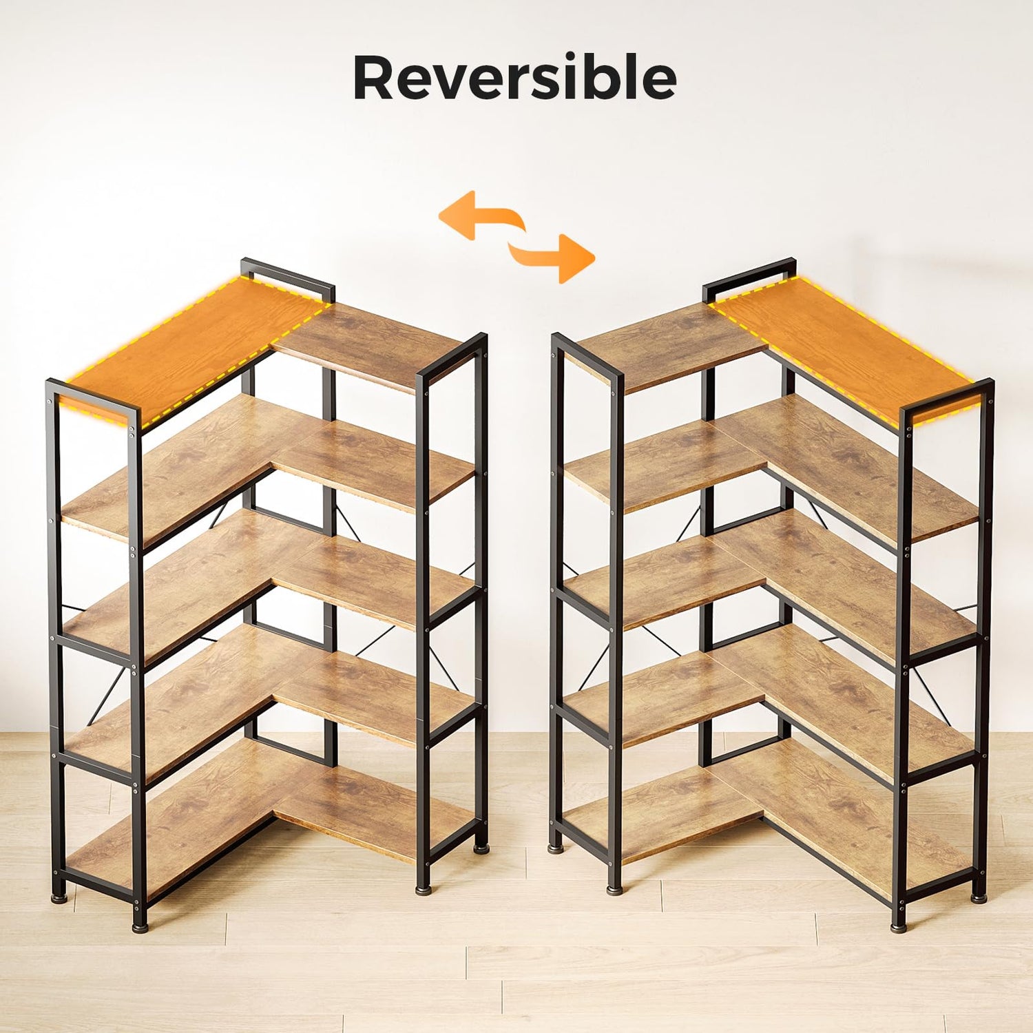 Casaottima Corner Bookshelf 5 Tier, 57 Inches Reversible Book Shelf for Living Room, Industrial Wooden Bookcase with Open Shelves and Metal Frame for Bedroom, Home Office, Kitchen, Rustic Brown