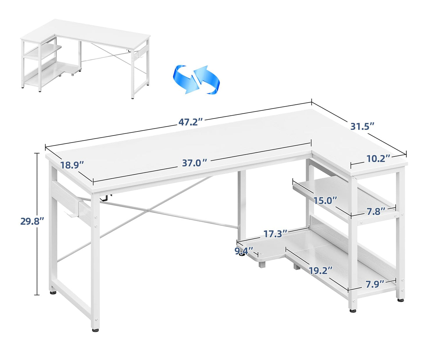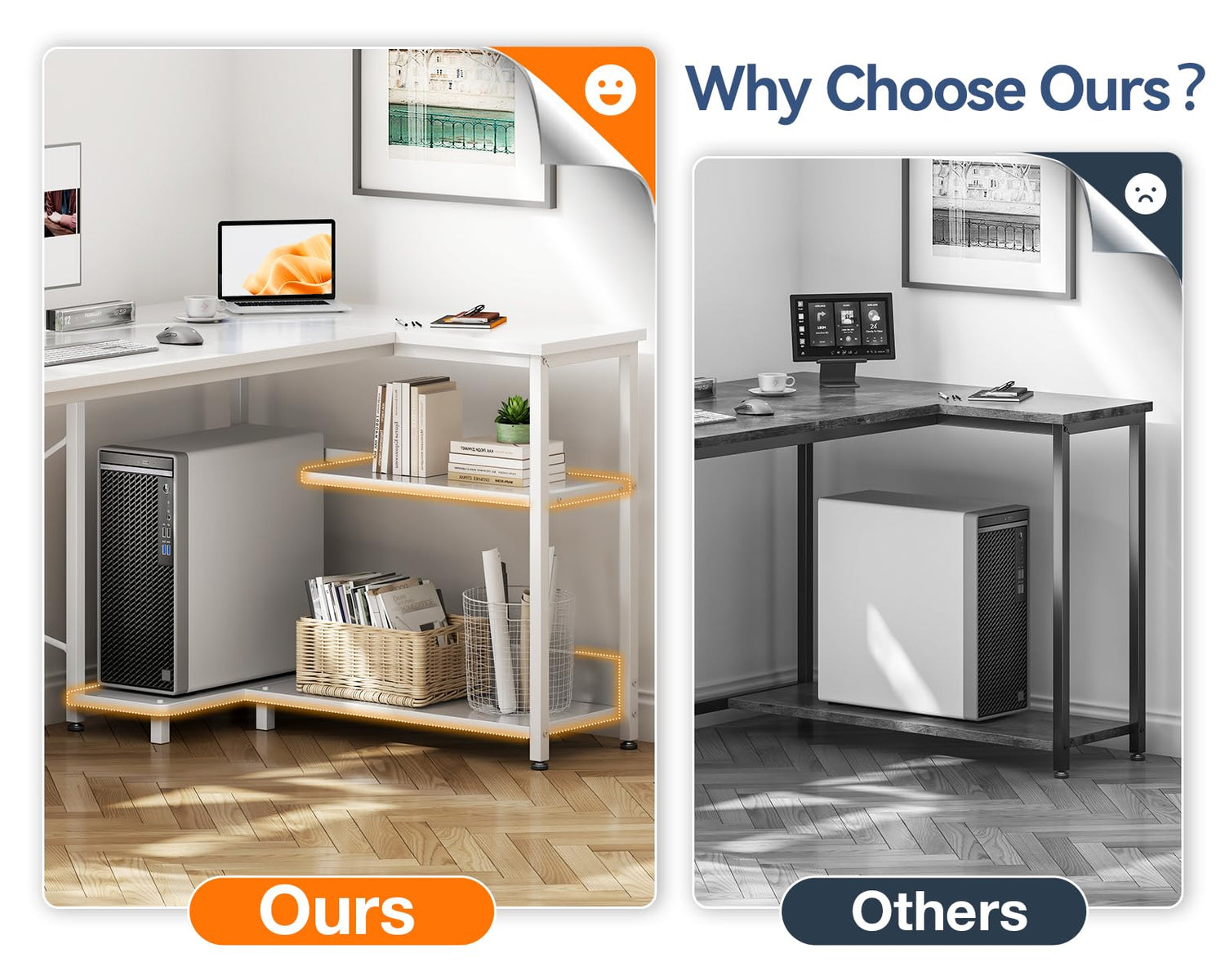 Casaottima L Shaped Computer Desk, 48 Inch Small Corner Desk with Storage Shelves & PC Stand, Reversible Gaming Desk for Bedroom, Modern Writing Study Table for Home Office, White
