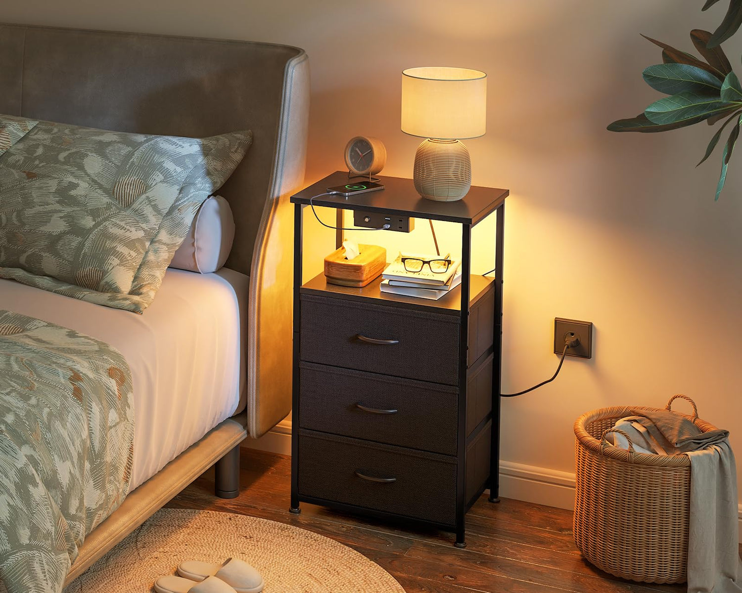 Casaottima Night Stand Set 2, Bedside Tables with Charging Station, LED Nightstand with Fabric Drawers, End Tablewith Open Shelf, Small Nightstand for Bedroom, Black