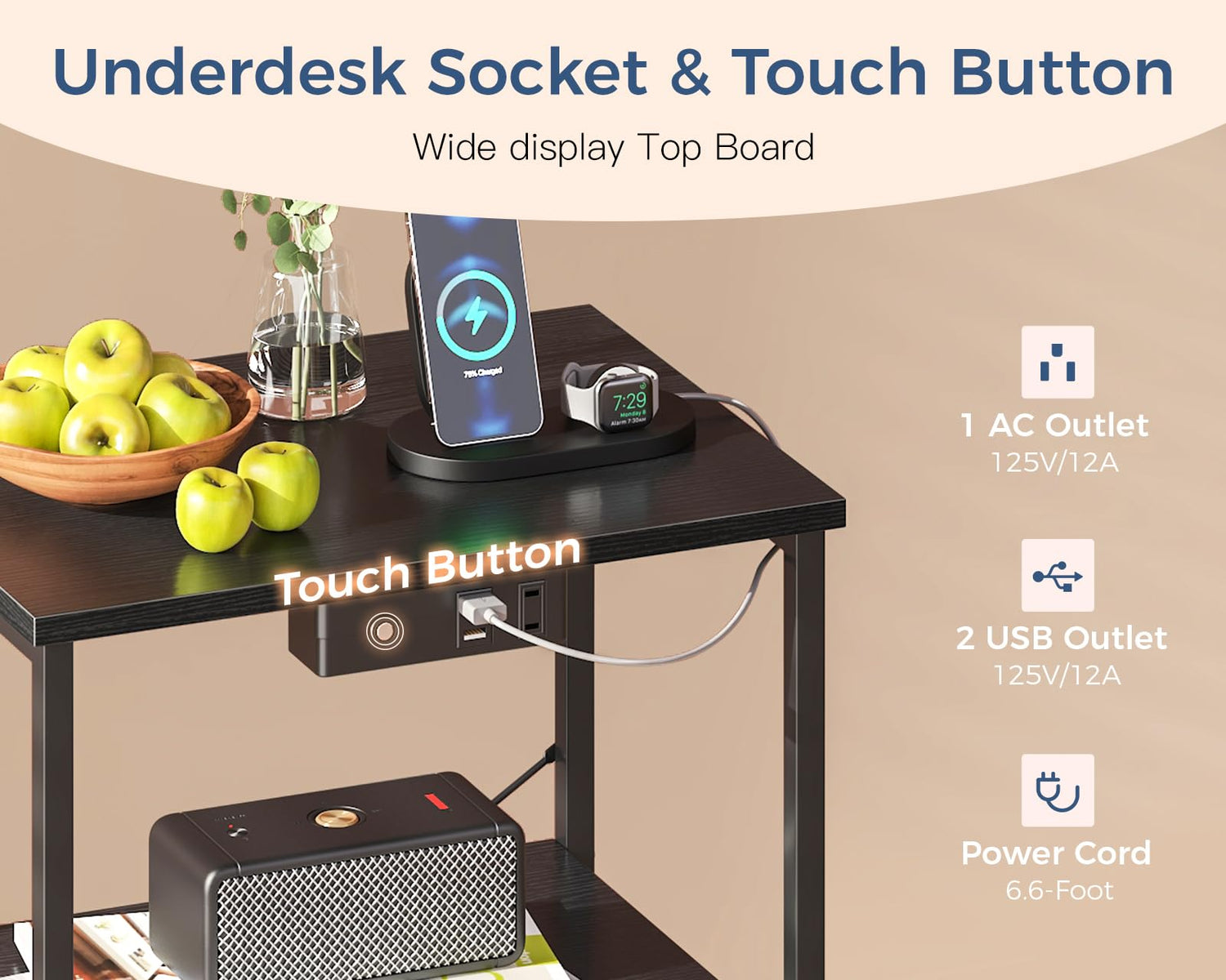 - Durable and Safe: The waterproof wooden top can be easily cleaned of stains. Under-table sockets provide more shelf space on the top board. X-shaped parts make the nightstand more stable. The adjustable foot pads can accommodate different floors and heights