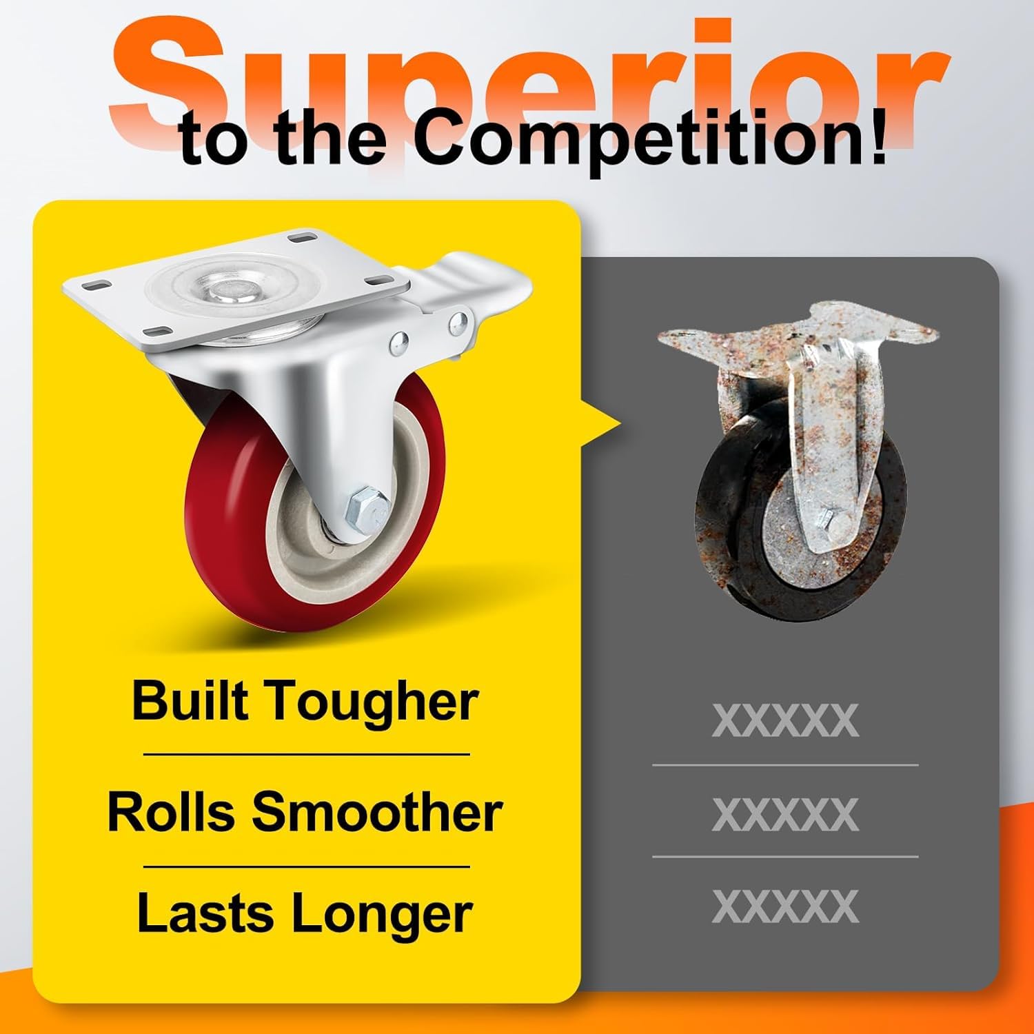 - 【Superior Material and Build Quality】 - Crafted with industrial-grade polyurethane (PU) wheels and reinforced steel plates, PUIPUM caster wheels offer excellent durability, wear resistance, and silent operation. The upgraded double ball bearings provide smooth rolling on any surface without leaving marks, ensuring a high load capacity of 600lbs for the set of four.