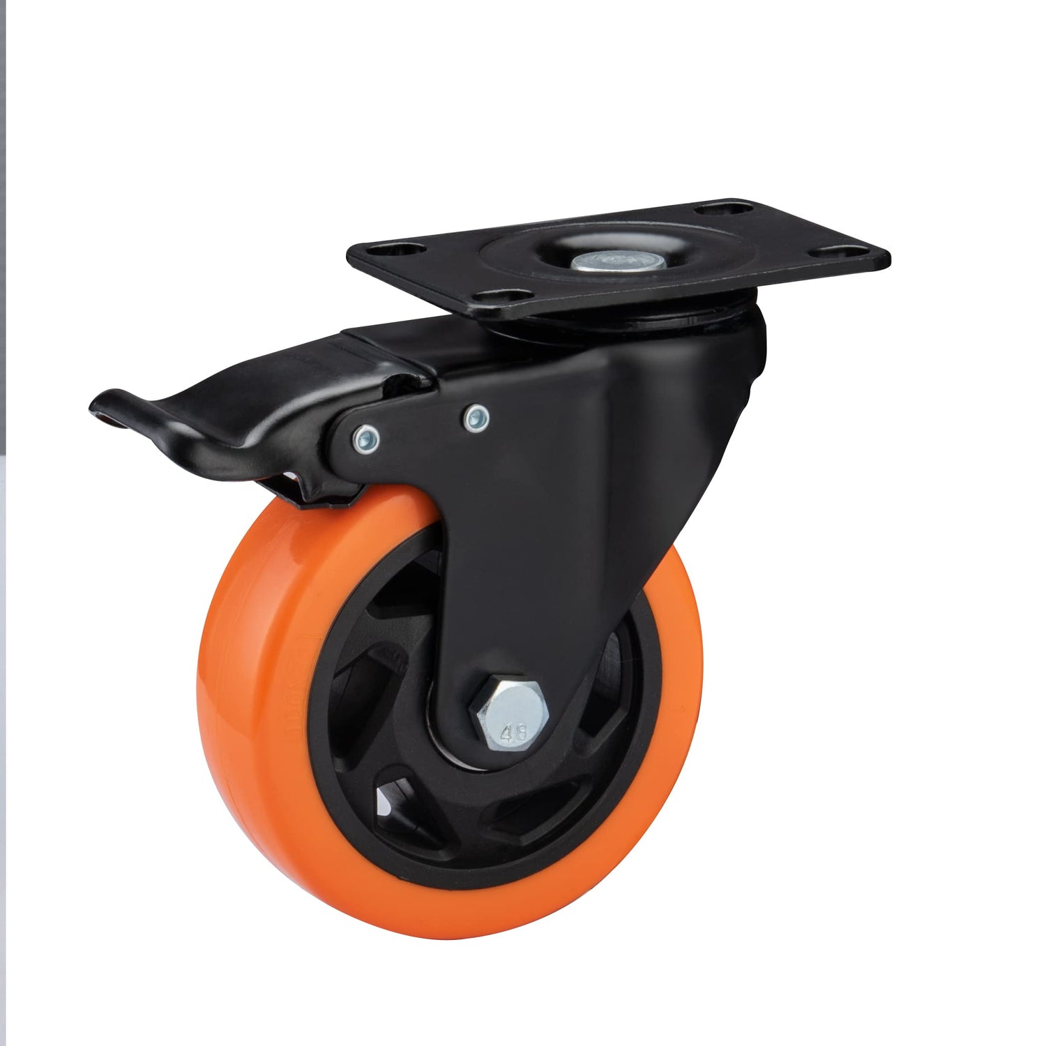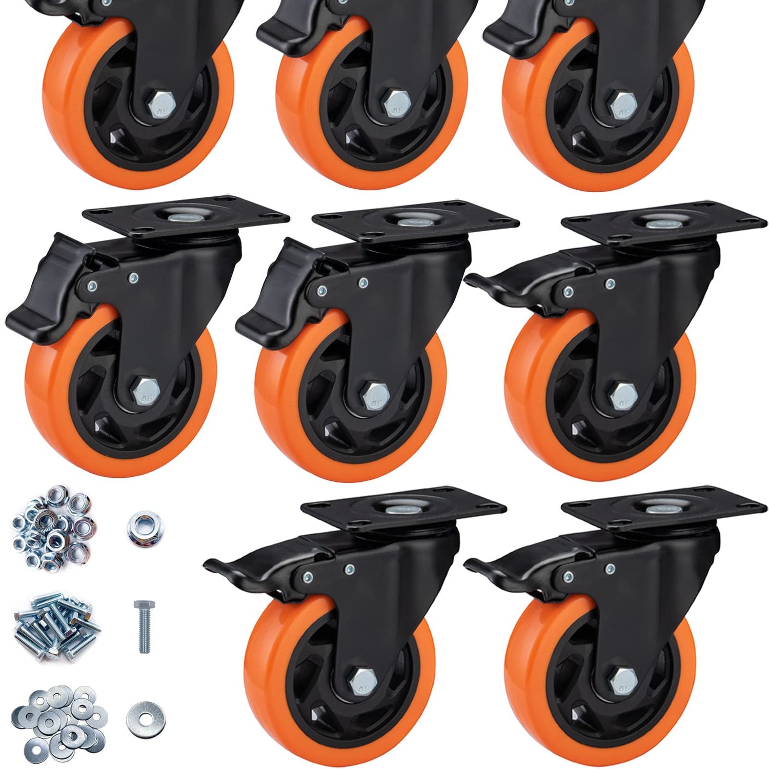 Casters, 4" Caster Wheels,Casters Set of 8 Heavy Duty - ASRINIEY Orange Polyurethane Castors, Top Plate Swivel Wheels, 8-Pack Industrial Casters with Brake, Locking Casters for Furniture and Workbench