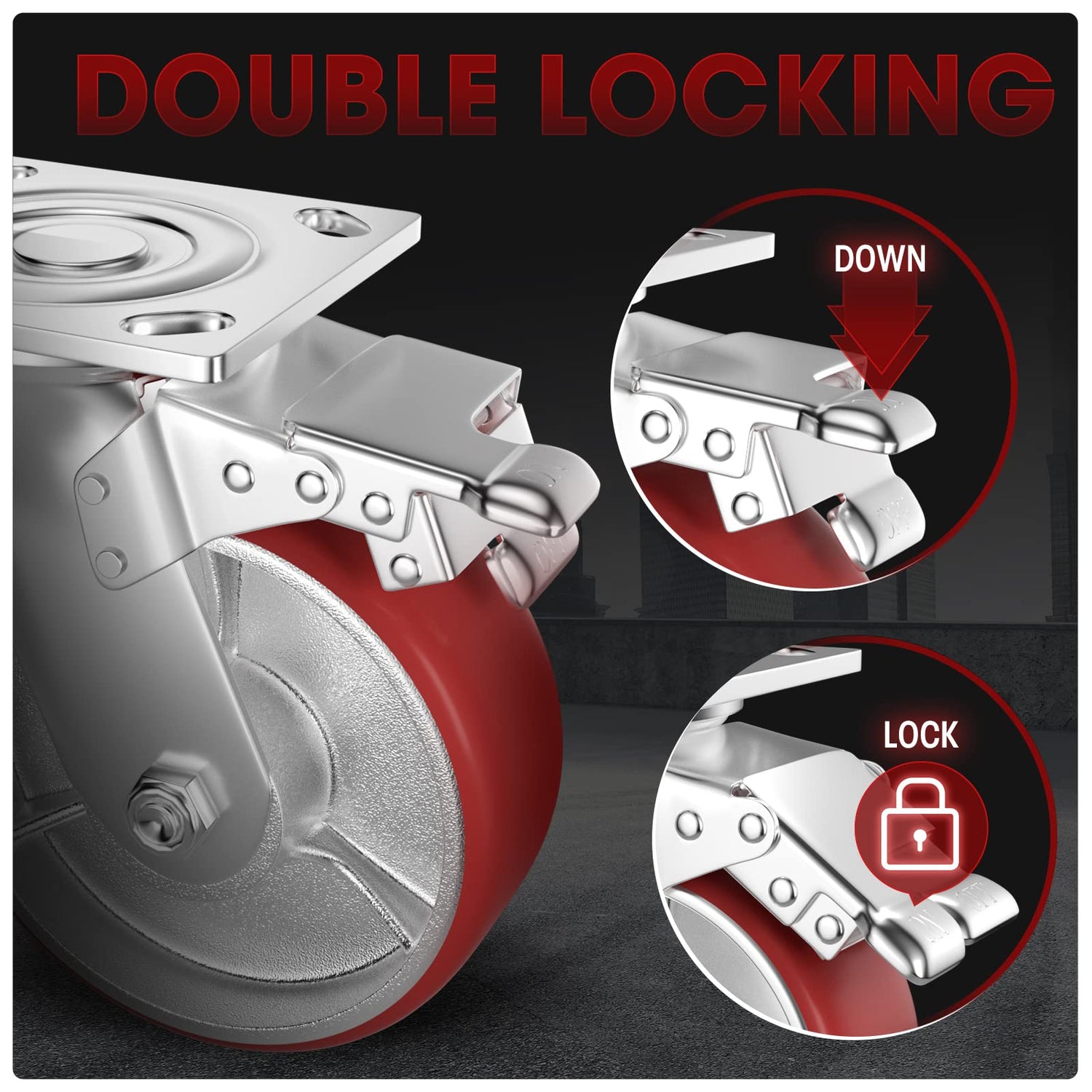 - Dual Lockable Casters with brake: Each industrial casters wheel has a double safety brake. The brake locks both the wheels and the swivel simultaneously. Simple to lock / unlock, and the locks hold securely. Our heavy duty casters can replace most toolbox casters, workbench casters, road case casters, furniture casters on the market