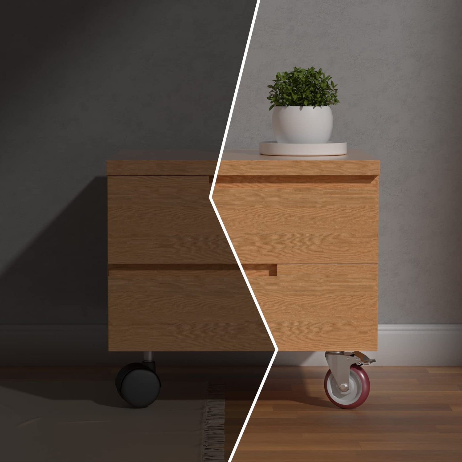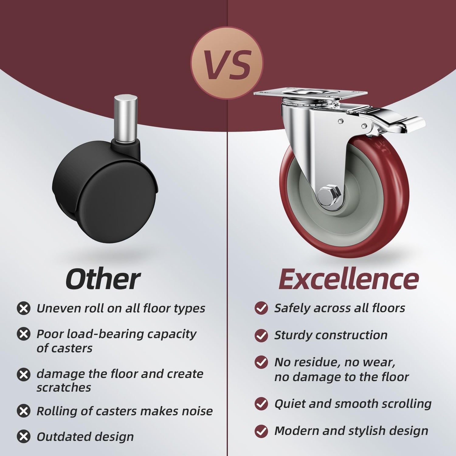 - Floor Protection - Polyurethane rubber wheels leaves no traces, absorbs vibrations and shocks, and keeps the movement quiet and scratch-free. Our Premium castor wheels will protect your flooring from damage and reduce your long-term facility maintenance expenses