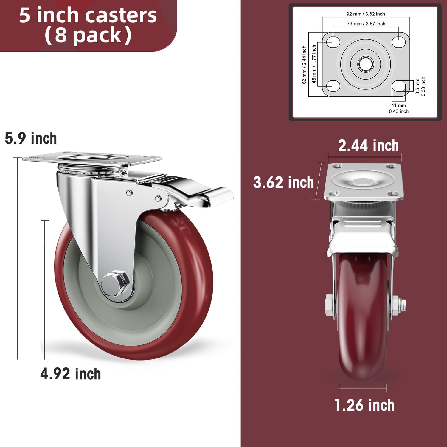 - Extremely Durable and Sturdy - Our 5 inch casters set of 8 Heavy duty are made from zinc plated steel, solid steel support which gives them a long lifespan and makes them resistant to corrosion and rust. Making a total of 1400lbs load capacity for 4 wheels