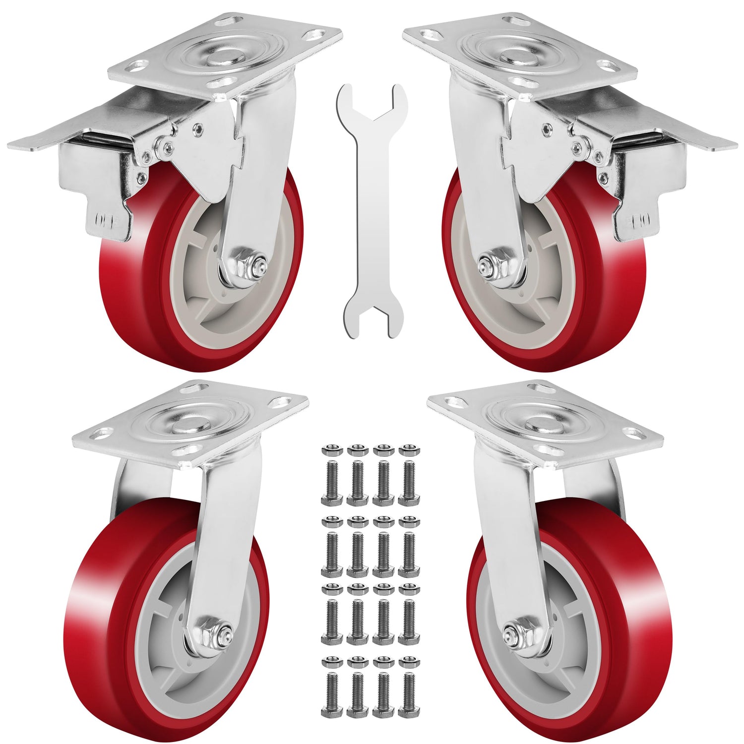 - HASSLE-FREE INSTALLATION: The casters set of 4 comes with 1 spanner, 16 nuts & 16 bolts to provide a hassle-free and easy installation. Two of 4 wheels also features an adjustable brake, enabling you to control the movement of your furniture