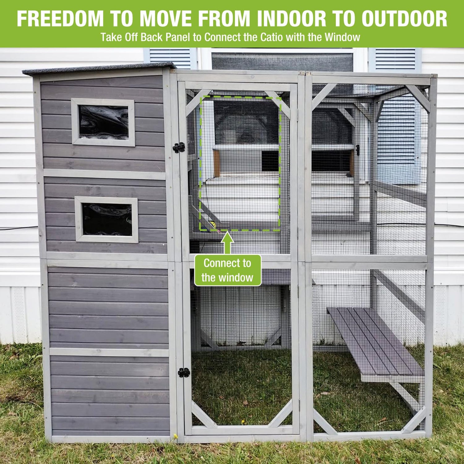 • 【Large Catio】Dimensions 76.8"L x 35.8"W x 69.3"H,perfect for 2-6 cats.Well-designed outdoor cat house includes 4 tier loft,3 sleeping houses,5 windows (4 acrylic windows,1 sliding window),3 platforms.