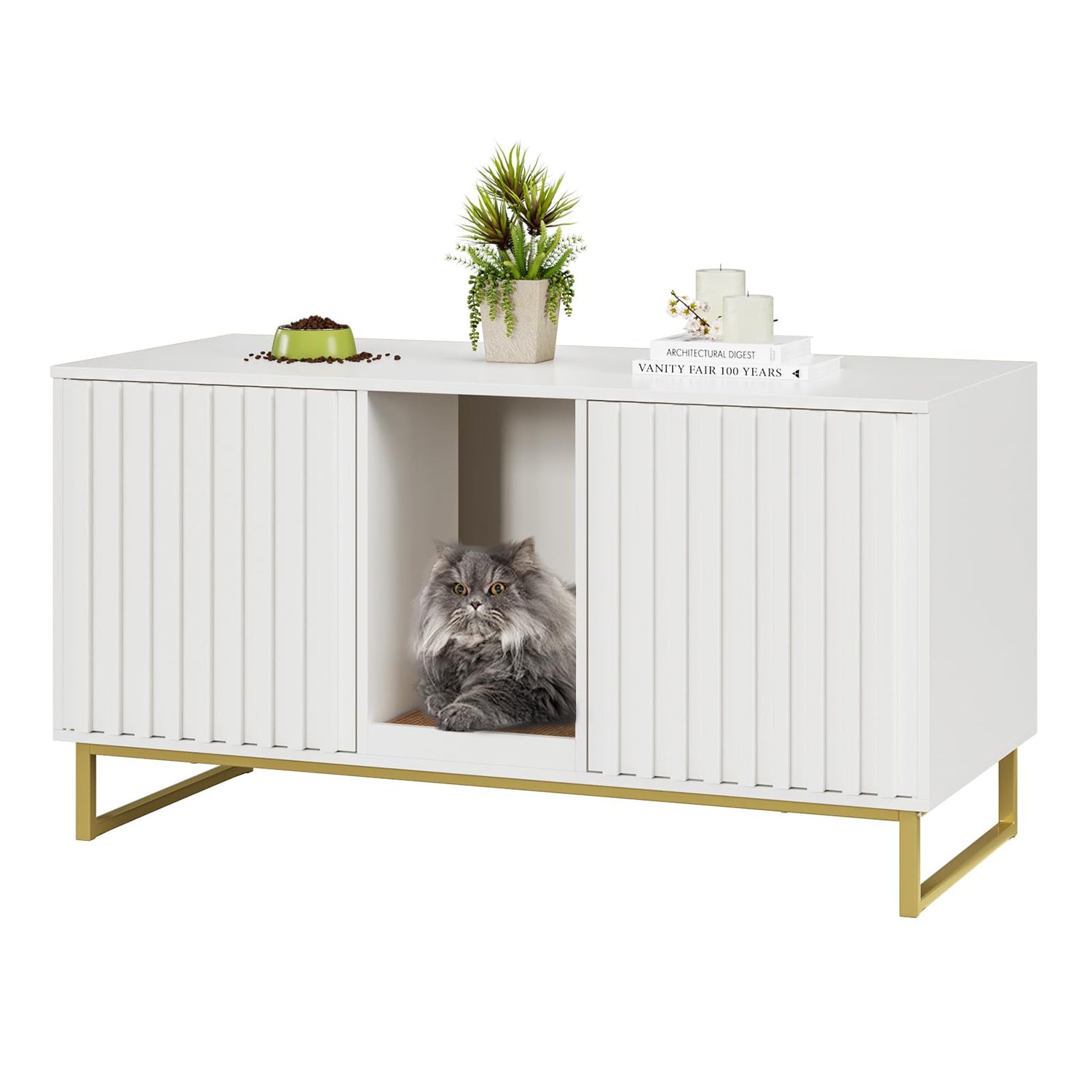 Cat Litter Box Enclosure for 2 Cats, 47.6’’ Litter Box Furniture Hidden with Scratch Pad, Double Room Large Cat Cabinet, Indoor Pet House TV Stand Side Table,Cats Washroom, White