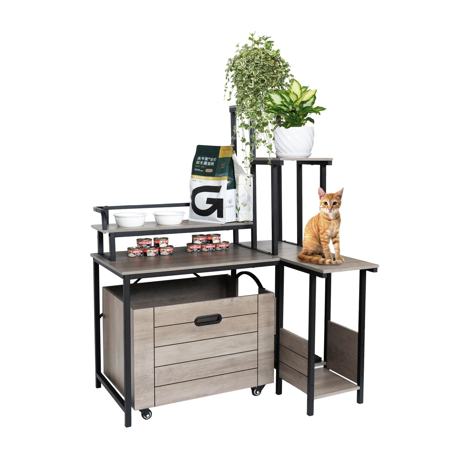 - Corner Flower Stand Design: The cat litter box cabinet features wood grain finish and black metal frame, the 2 in 1 functional design of cat cabinet and flower stand maximizes the use of space, fits well into any home decor.
