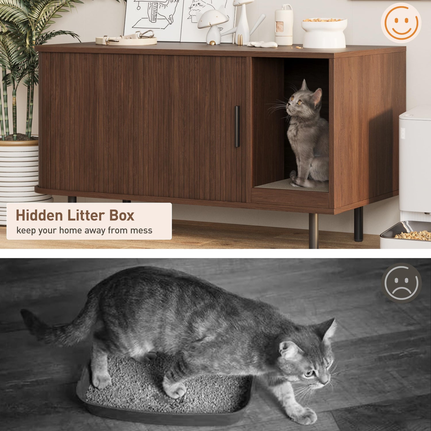 - 【More Privacy & Less Odor】 Enclosed Litter Box Furniture provides a cozy and comfortable private space for your cat. Put in a litter box and it becomes your cat's private washroom. Put a cat bed in and your cat has a cozy and quiet nest. The enclosed cat cabinet has venting holes in the back to reduce odors while allowing your cat to breathe fresh air.