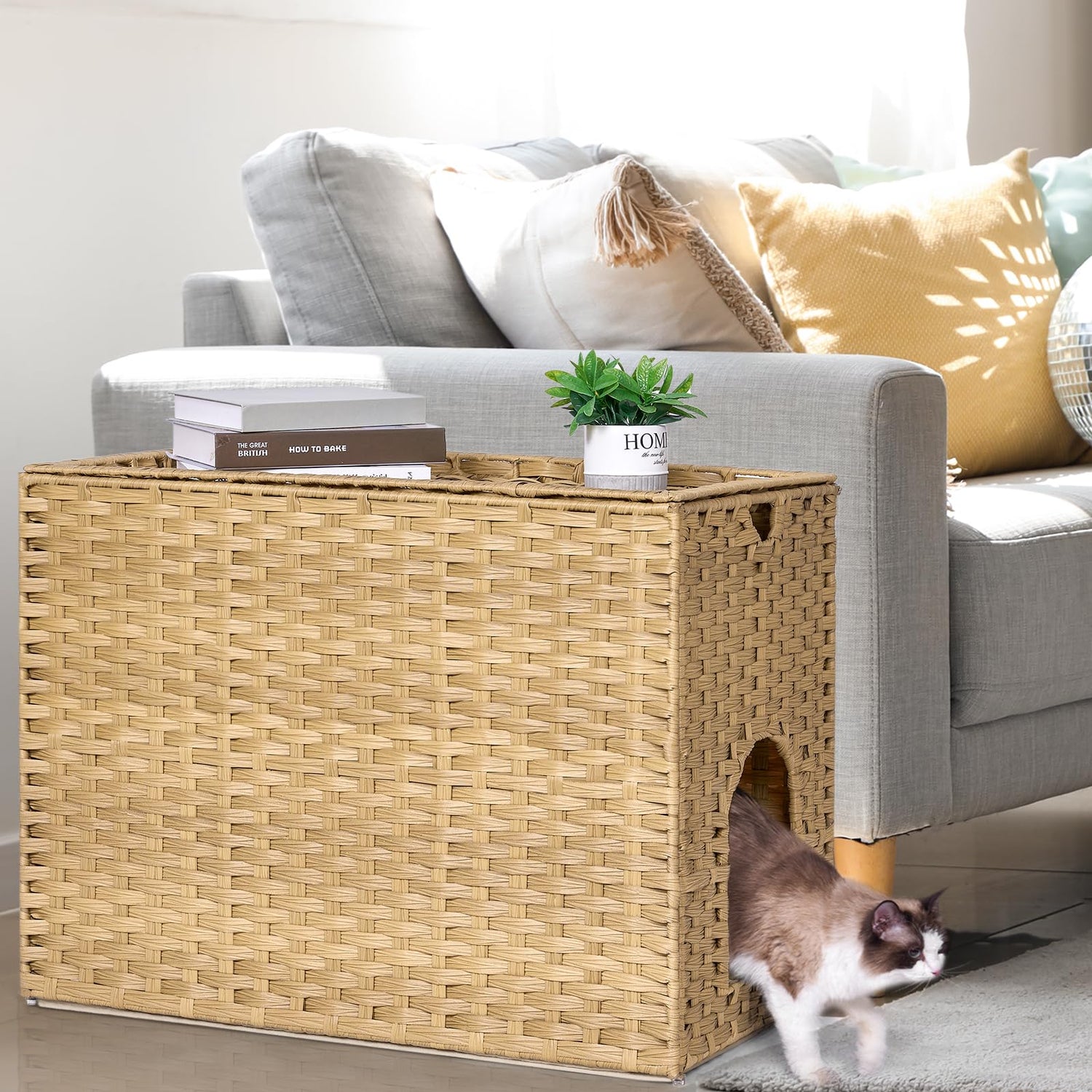 - Bright & Fresh: This litter box enclosure provides a secure environment for your cat while maximizing natural light. The breathable rattan material lets sunshine in while effectively reducing unpleasant odors, creating a pleasant space for your pet.