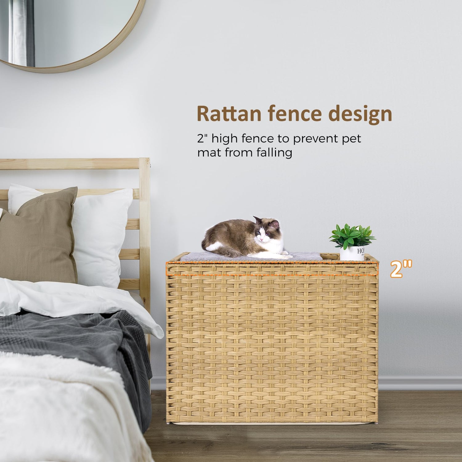 - Ample Space & Safety Features: With dimensions of 30.3'' L x 18.2'' W x 20.5'' H, our cat house accommodates most litter boxes comfortably. The elevated rattan fence (2” high) ensures that any bedding remains securely in place, providing peace of mind.