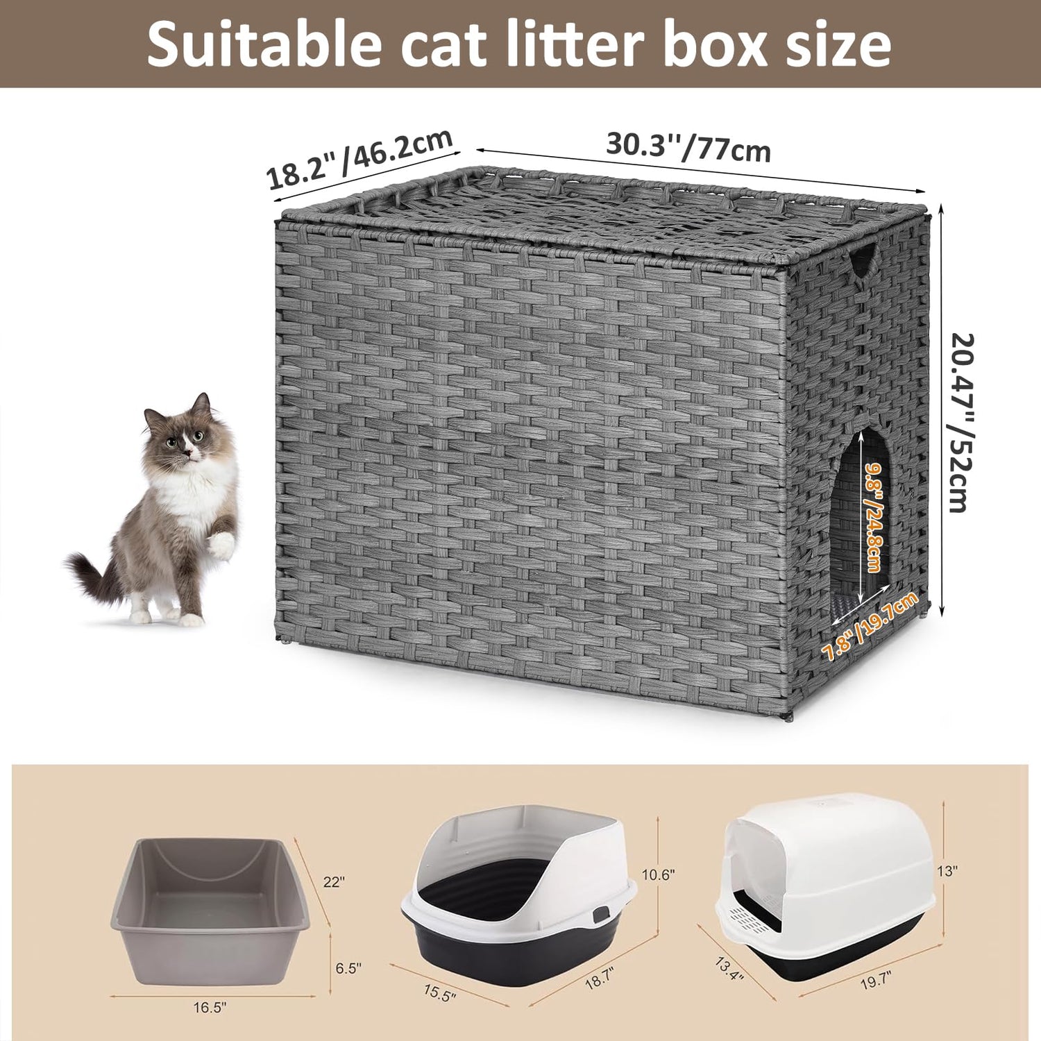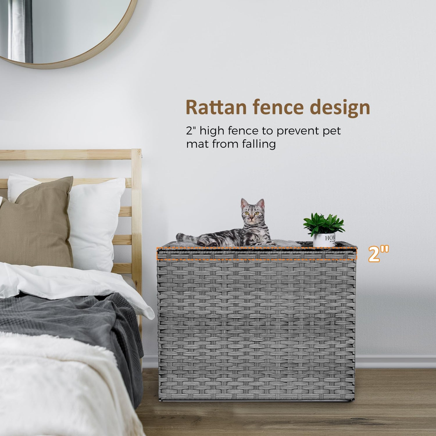 - Ample Space & Safety Features: With dimensions of 30.3'' L x 18.2'' W x 20.5'' H, our cat house accommodates most litter boxes comfortably. The elevated rattan fence (2” high) ensures that any bedding remains securely in place, providing peace of mind.