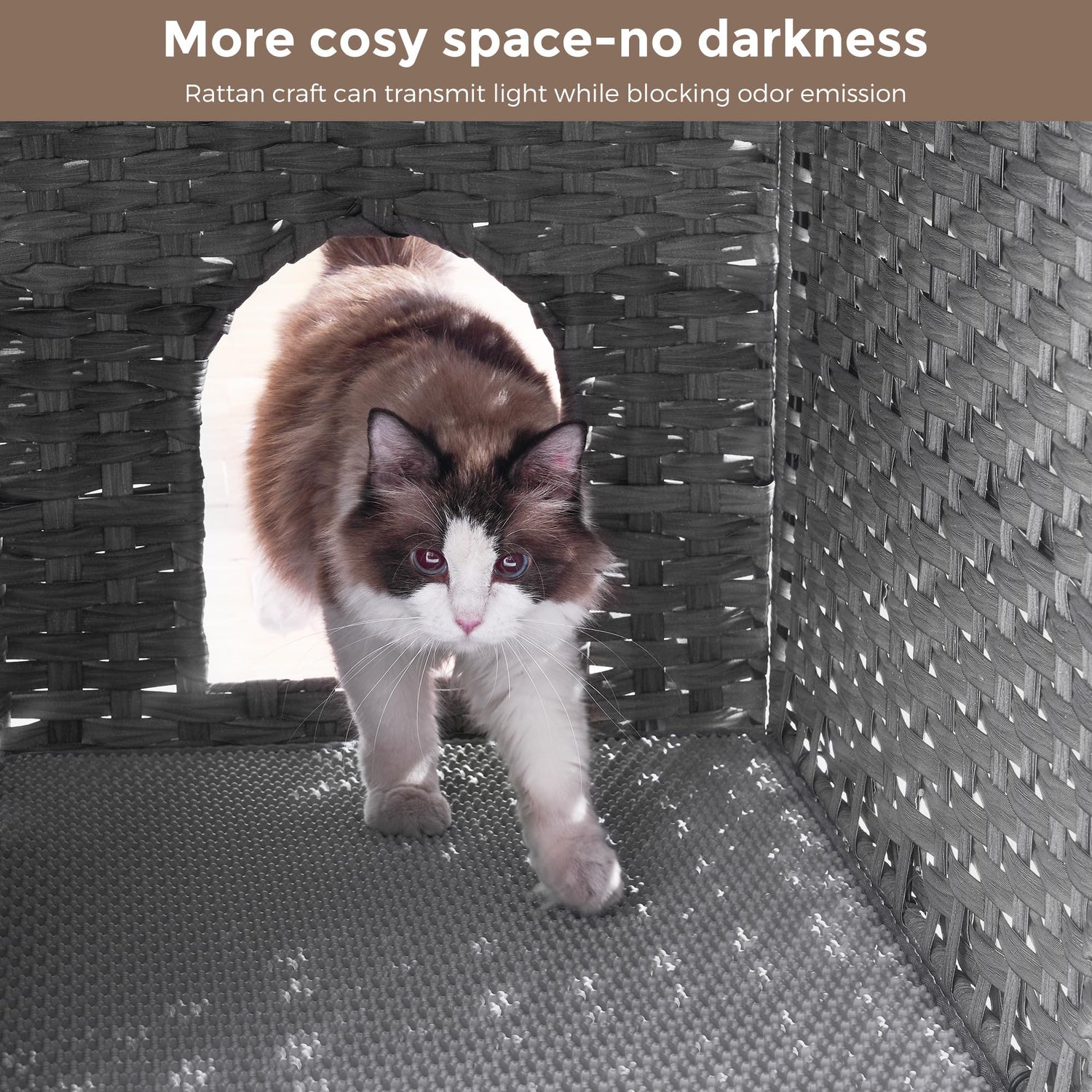 - Bright & Fresh: This litter box enclosure provides a secure environment for your cat while maximizing natural light. The breathable rattan material lets sunshine in while effectively reducing unpleasant odors, creating a pleasant space for your pet.