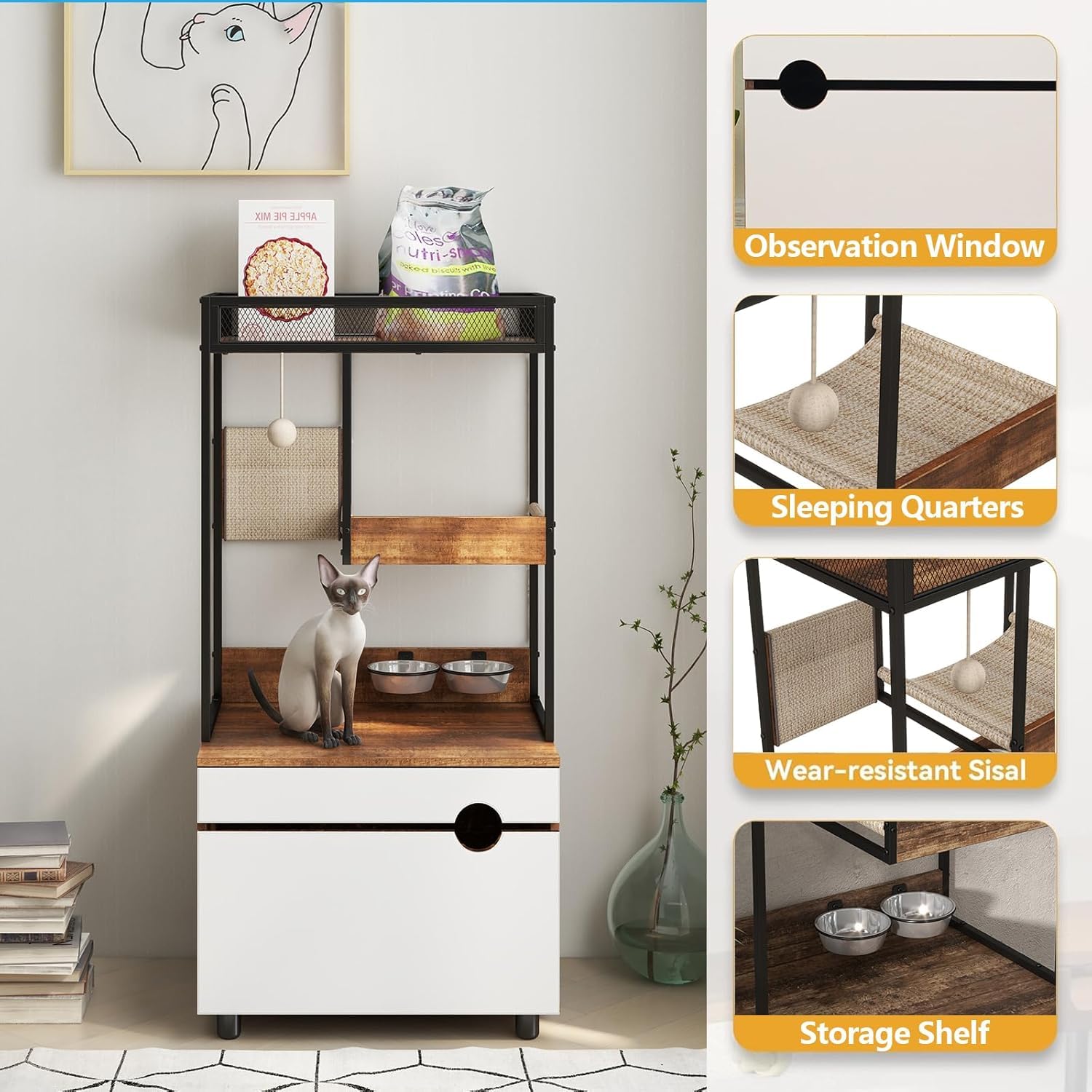 - MULTIFUNCTIONAL STORAGE CAT FURNITURE: This cat litter box enclosure storage rack adopts a 2-in-3 functional design of cat cabinet and storage bookshelf, with ample storage space. The three-tier bookshelf design allows it to be used as a bookshelf, display cabinet, or convenient storage cabinet to conveniently store cat litter, cat shovels, other cat necessities, and books, keeping your space neat and organized. The combined design of the cat litter box and storage rack is super practical.