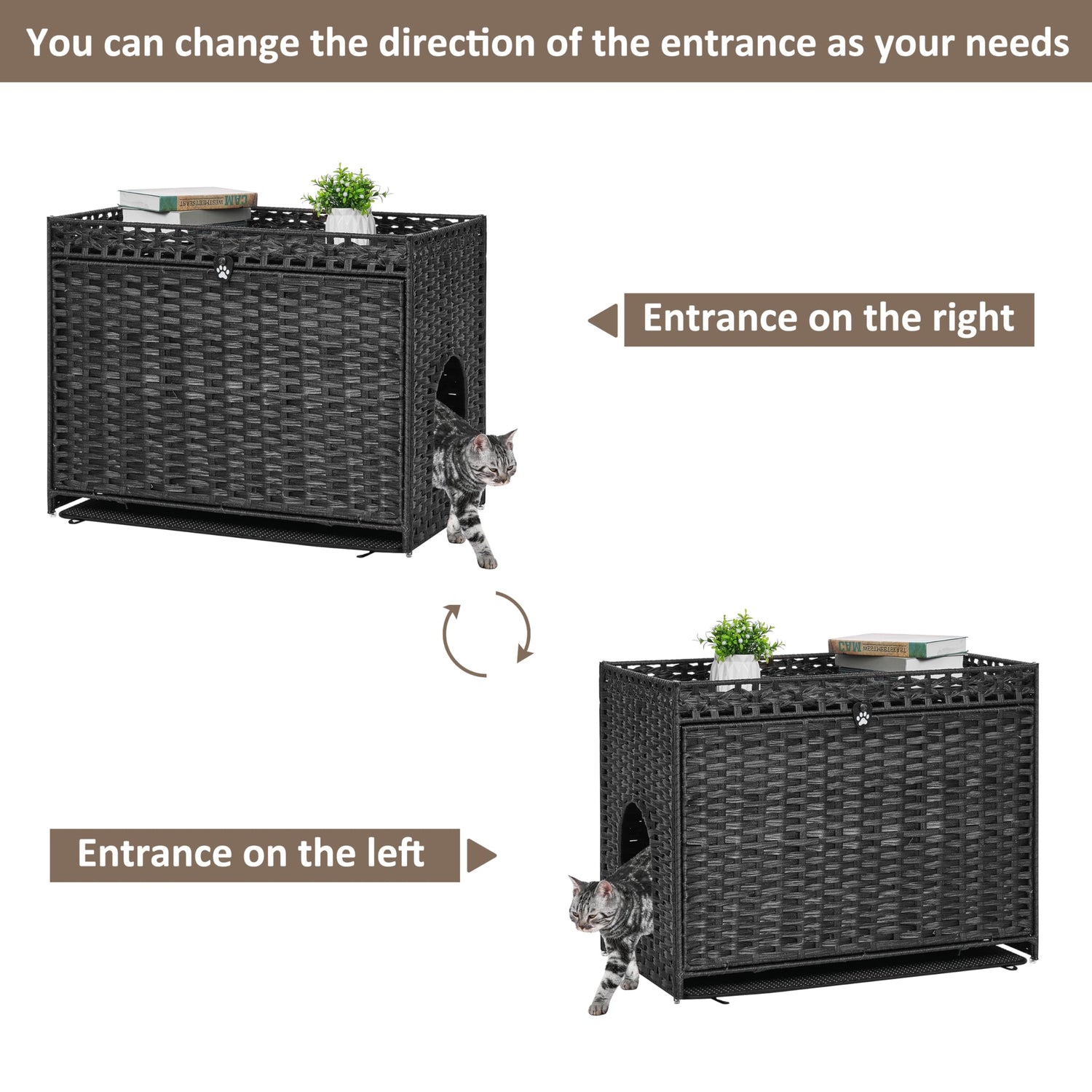 Cat Litter Box Enclosure with Soft Litter Mat; Hidden Cat Washroom Furniture with Door; Handwoven Rattan Cat House with Large Space; Pet Crate for Living Room, Bedroom, Balcony (Black)