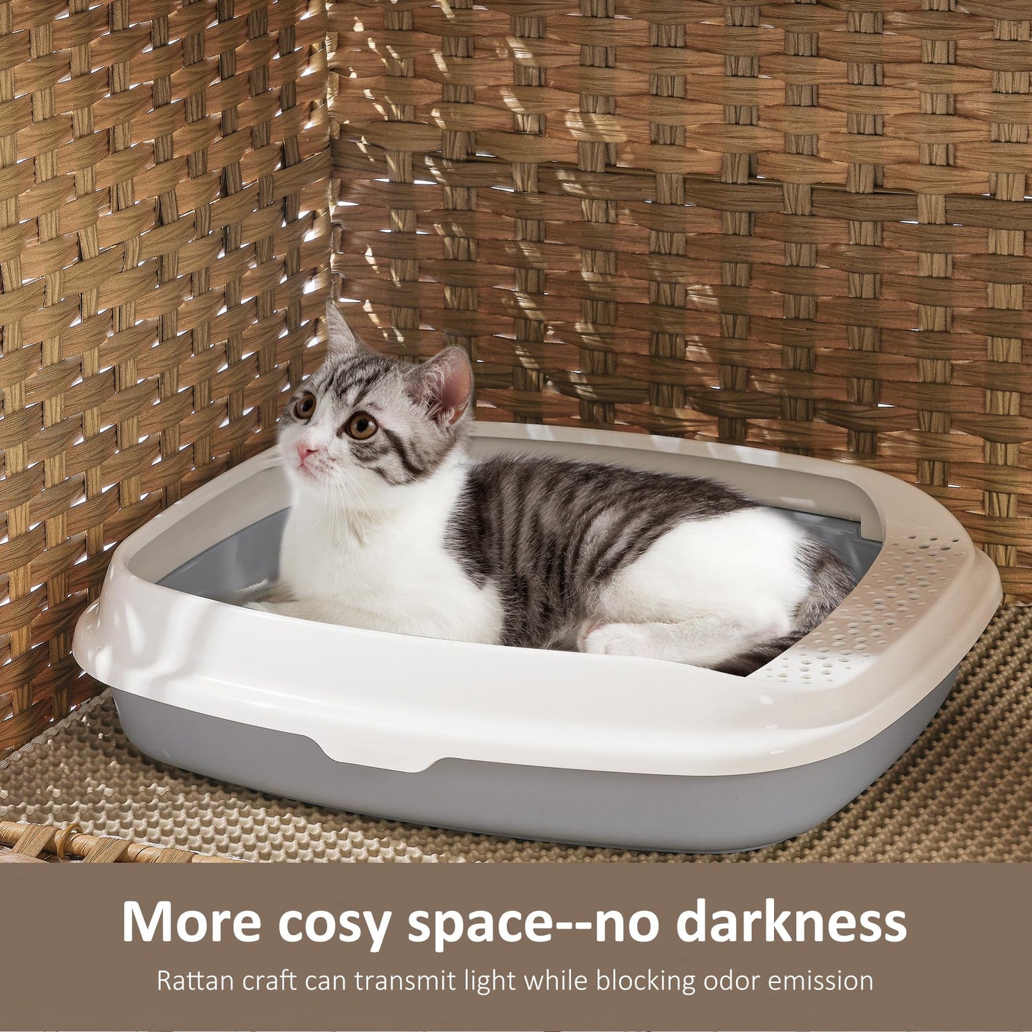 - 【More sunshine, Less odor】 The cat litter box enclosure offers a private place where cats feel safe to answer nature’s call. The rattan cat litter box enclosure can transmit light, allowing cats to enjoy the sunshine while blocking odor emission.