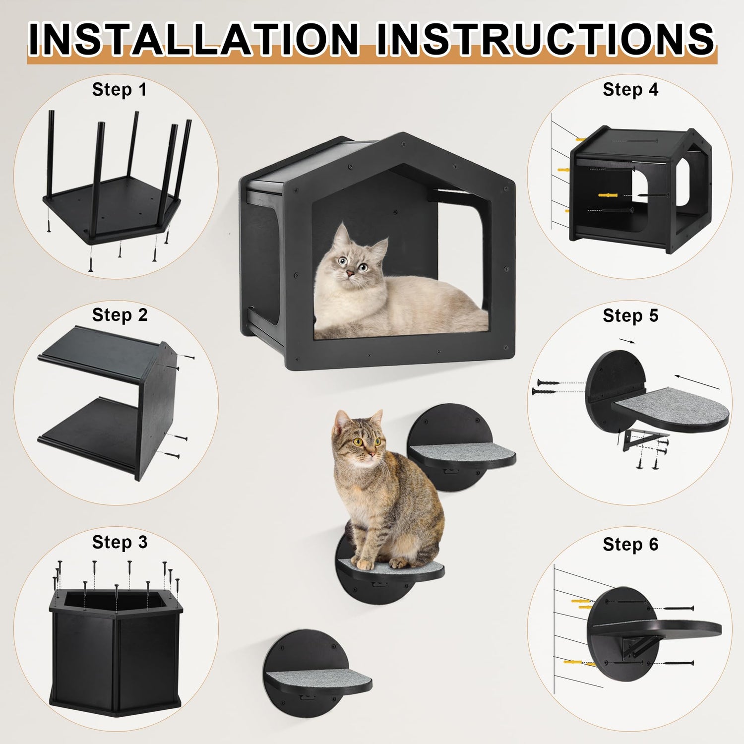 Cat Wall Shelves and Perches - House Fit for Cats Up to 25Lbs, 1 Condo and 3 Large Steps With Scratching Pad, Climbing Shelf for Indoor, Furniture