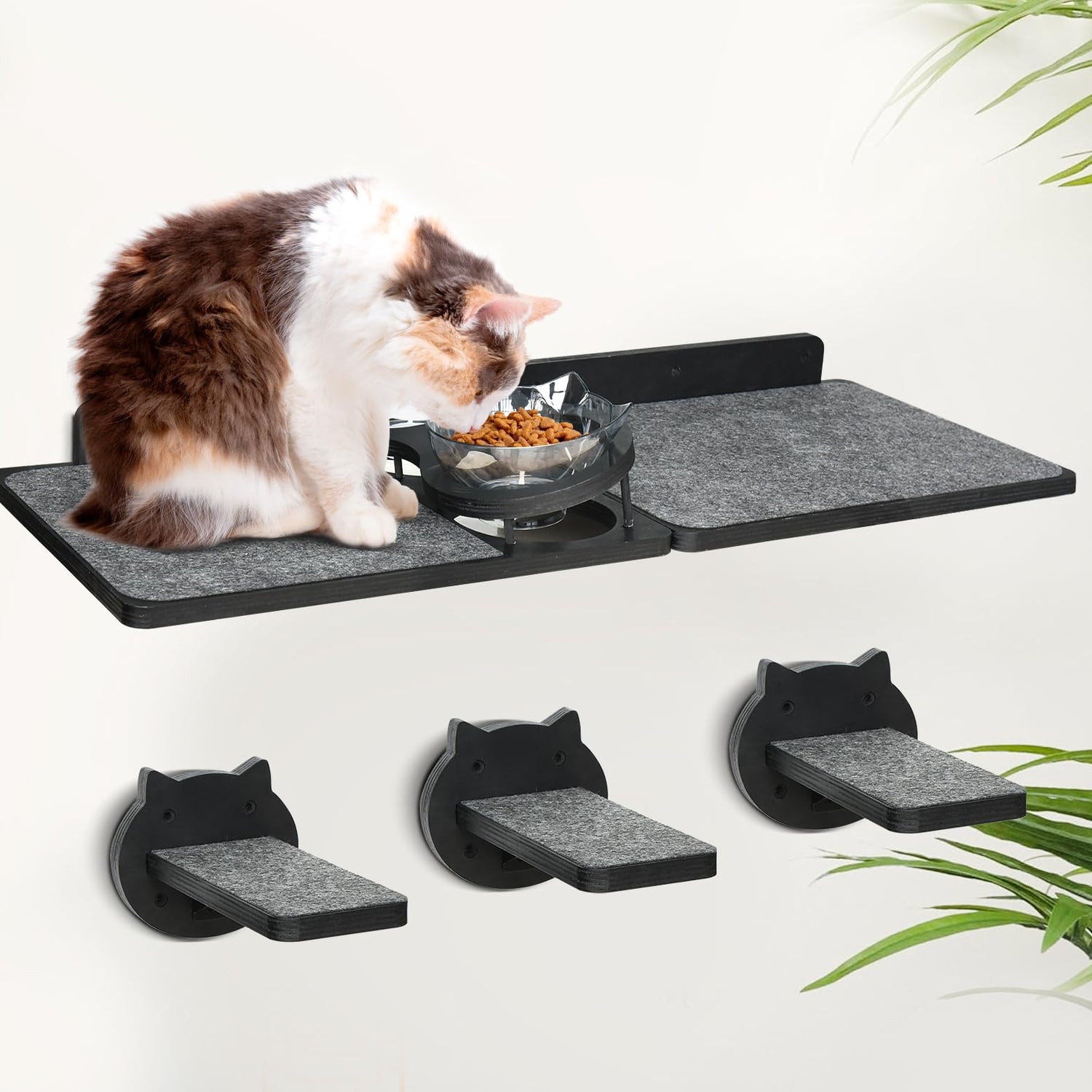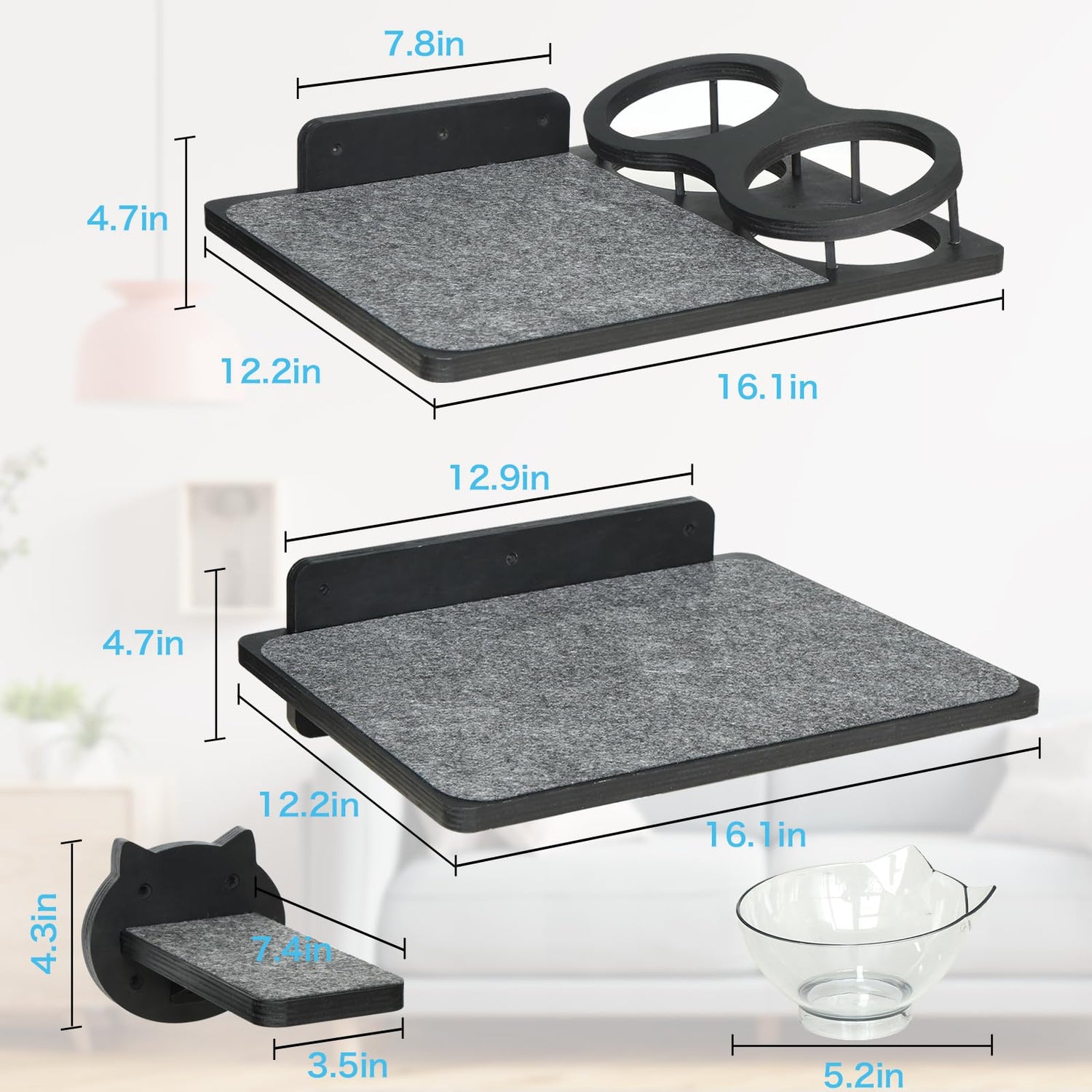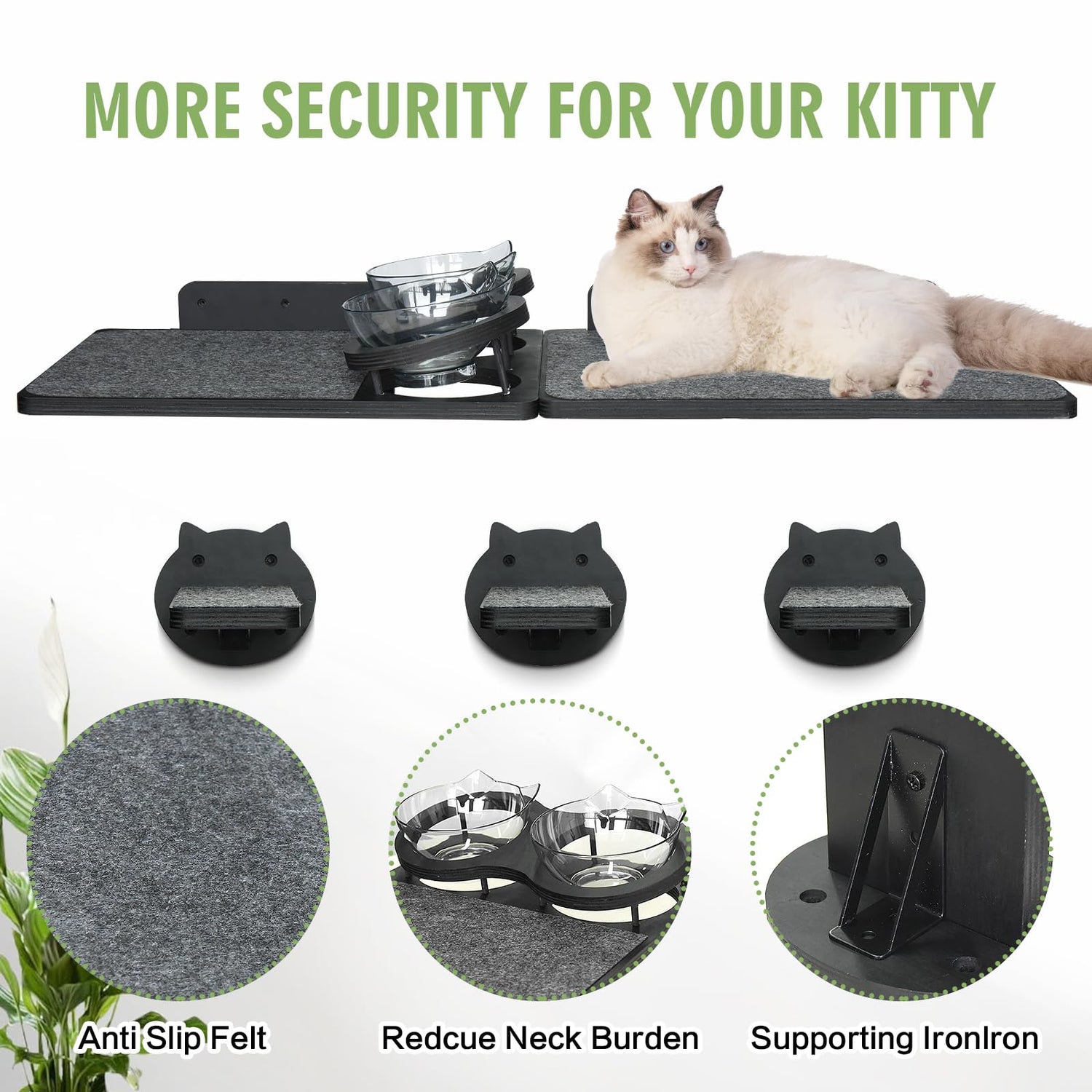 - 🐾【Versatile Set of 2 Cat Wall Shelves】 Our cat wall shelves is more than just a simple cat climbing shelf, it's a comprehensive cat wall furniture that combines playing, resting and feeding to meet your cat's all-around needs. Unlike other cat wall shelves, ours features a dog-proof cat feeding station and in sloped design protect cat's cervical vertebrae while eating. With a variety of designs, our cat shelves for wall are a great companion for your cat's daily life, helping them stay active and happy.