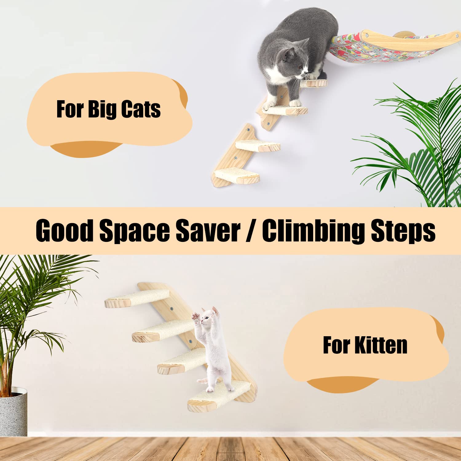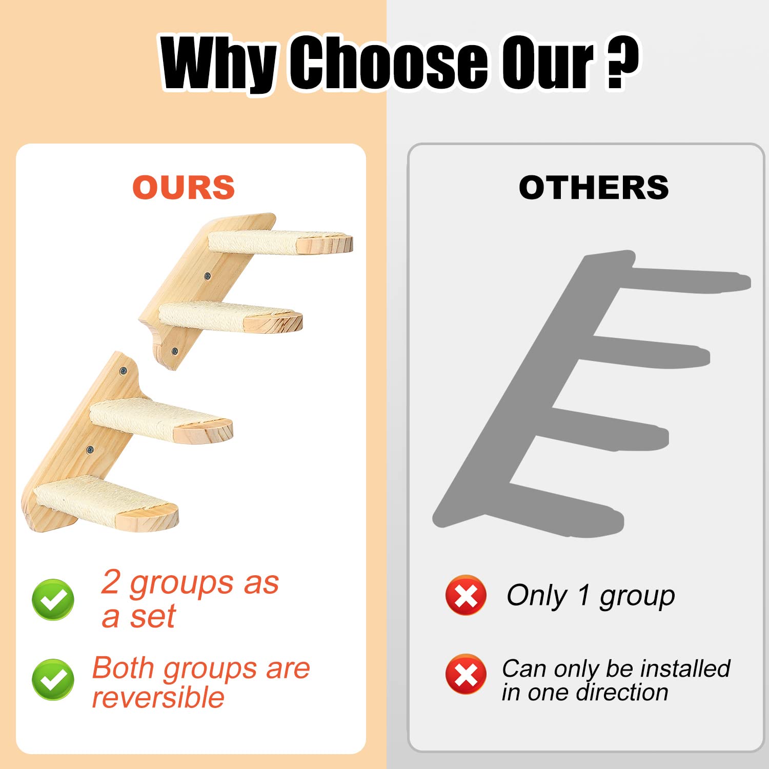 - DIY Reversible Direction Design: Reversible orientation design cat stairs, different from one-way cat climbing shelf, LEFT TO RIGHT or RIGHT TO LEFT mounting cat climbing stairway for you to install in any direction you like. Shelves for cats on the wall give your cats an enjoyable environment to keep them active and happy