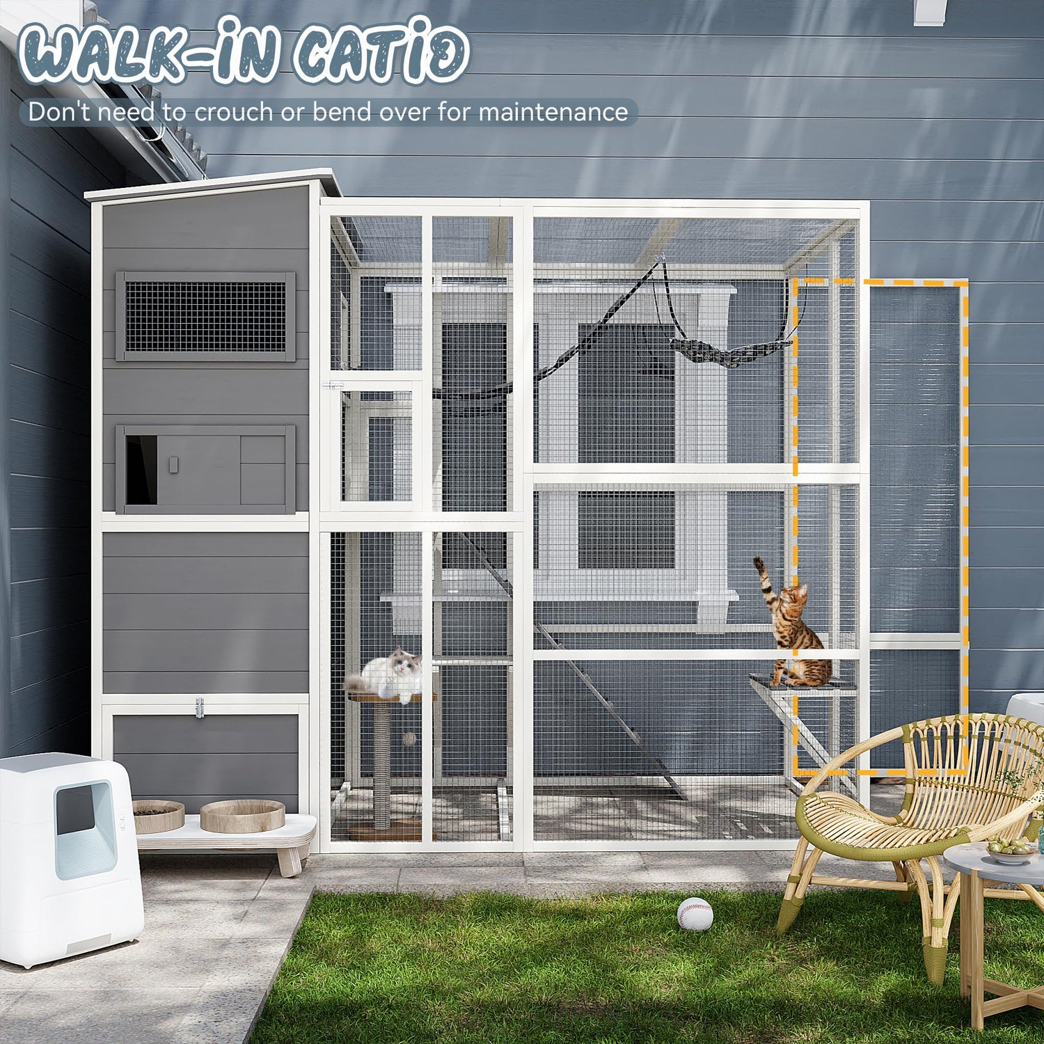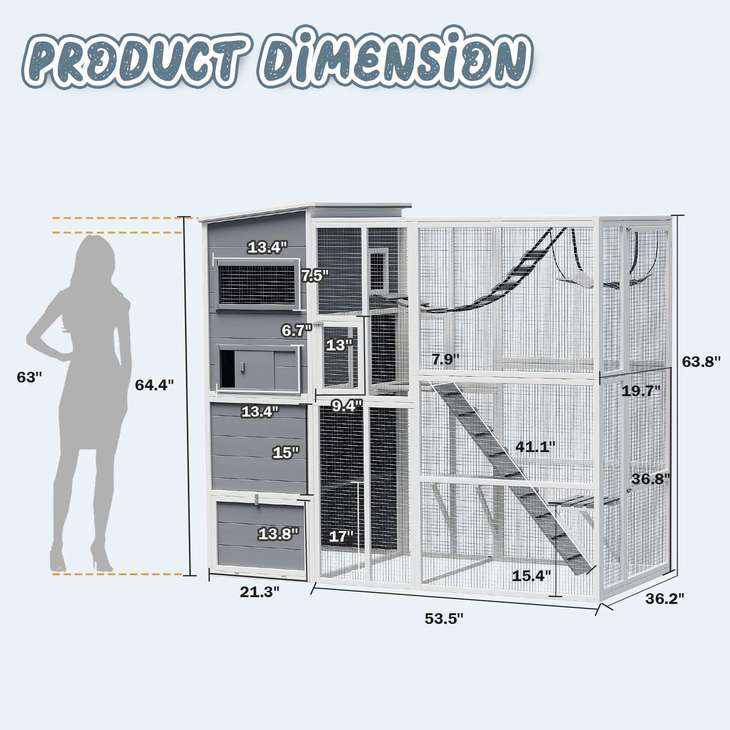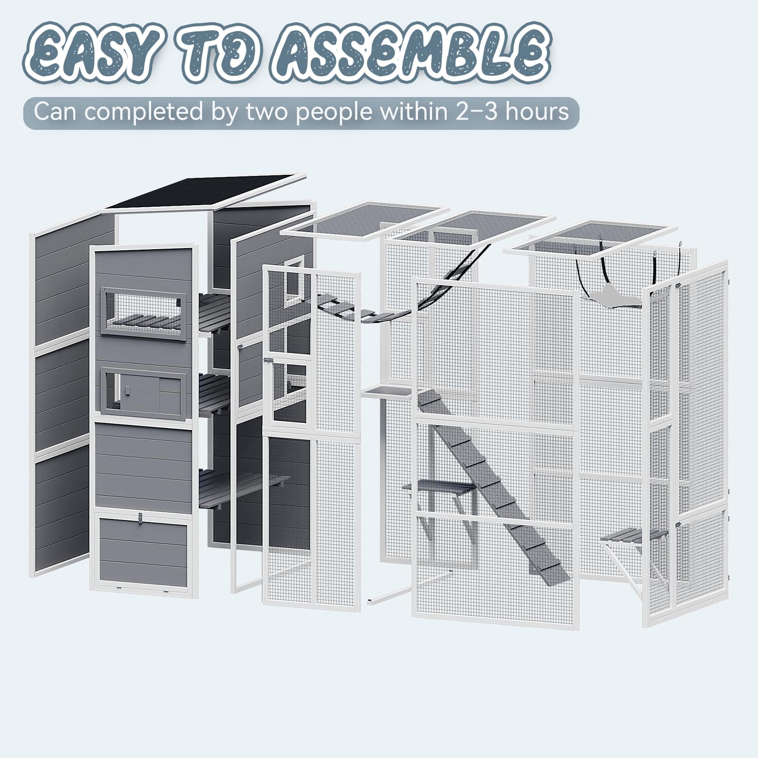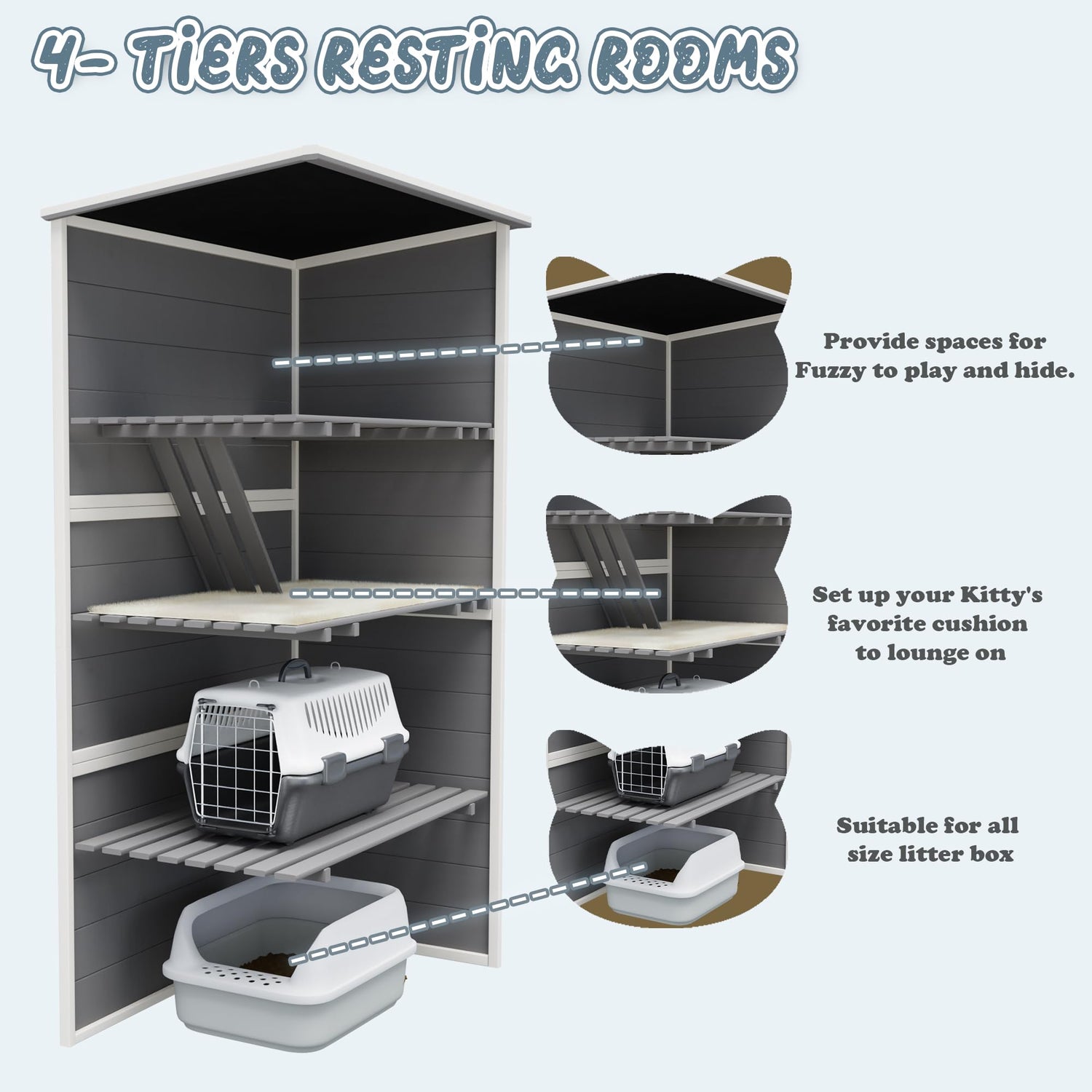 - [Four-Tier Cat House]: Our catio offers a multi-level space for your cat to explore. The bottom level has a side door for litter box replace, the middle levels serve as cozy rest areas, and the top level connects to a cat bridge and hammock, providing plenty of entertainment and comfort