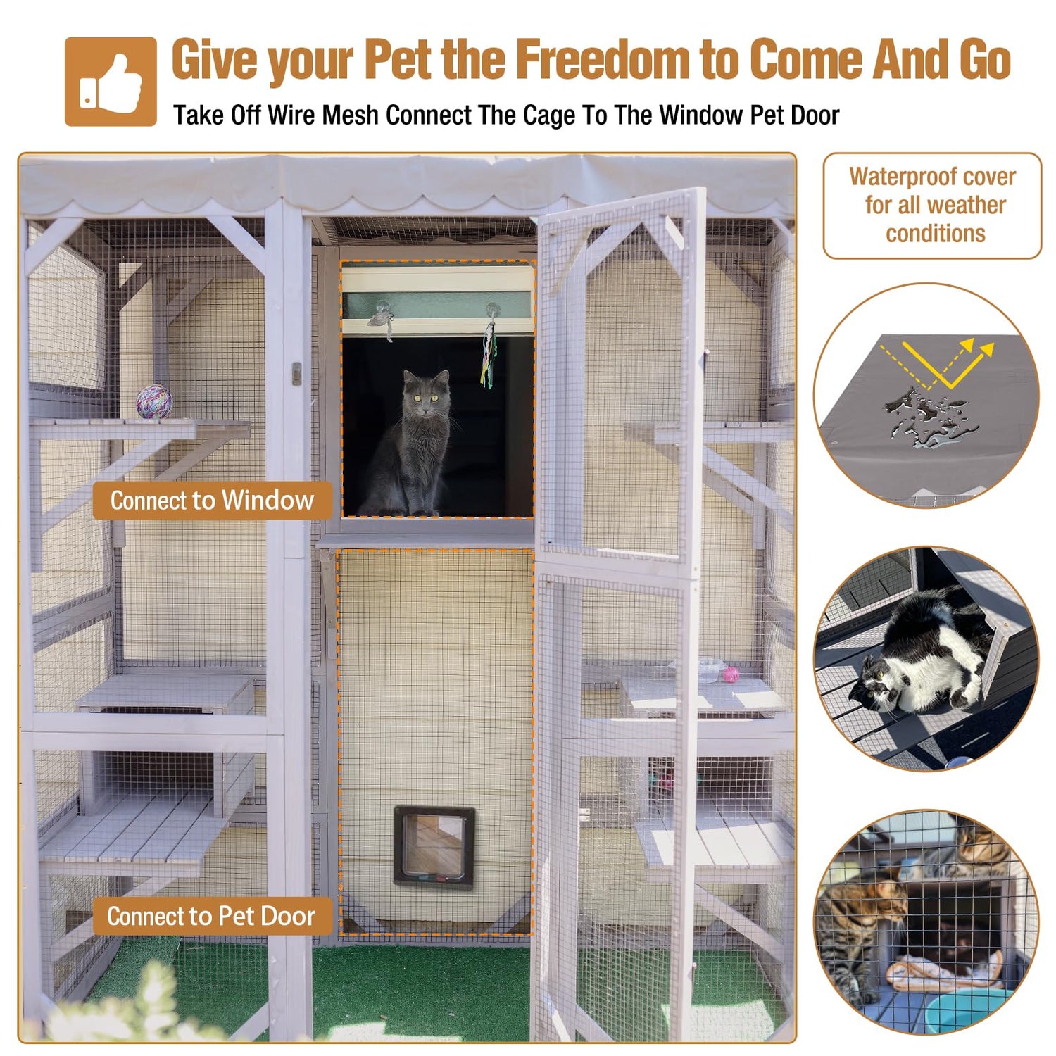- 【Interactive Cat House】 - Our cat outdoor enclosure or catio features a spacious 70.1’’ design with an upgraded resting box, 5 spacious platforms and 3 doors for cleaning, entering, feeding and convenient interactions.