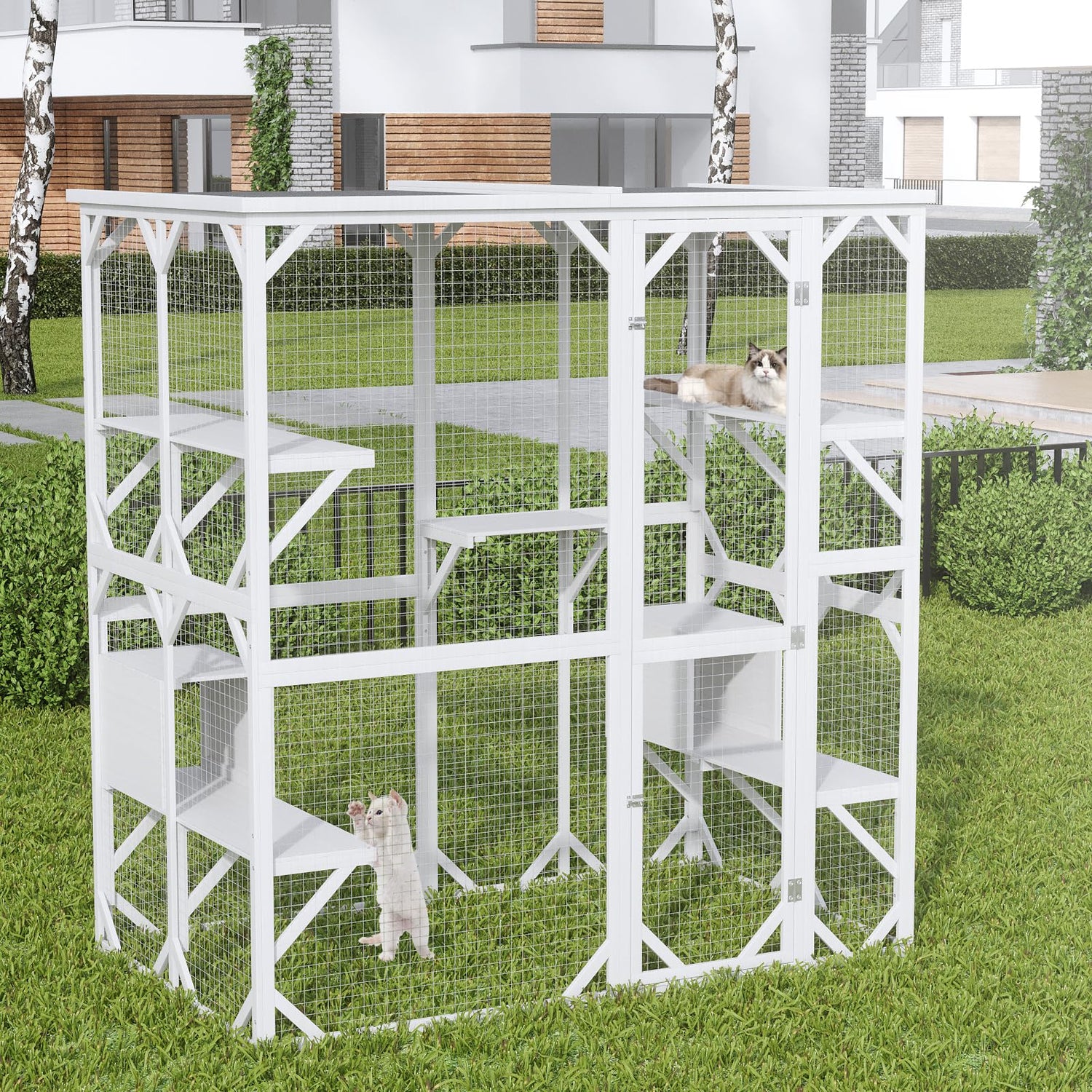 Details: Catio Outdoor Cat Enclosure with Roof 71.3" Height Cat Wooden House Large Cat Cage with 3 Jumping Platforms and 2 Napping Houses for Cat Activity (White)