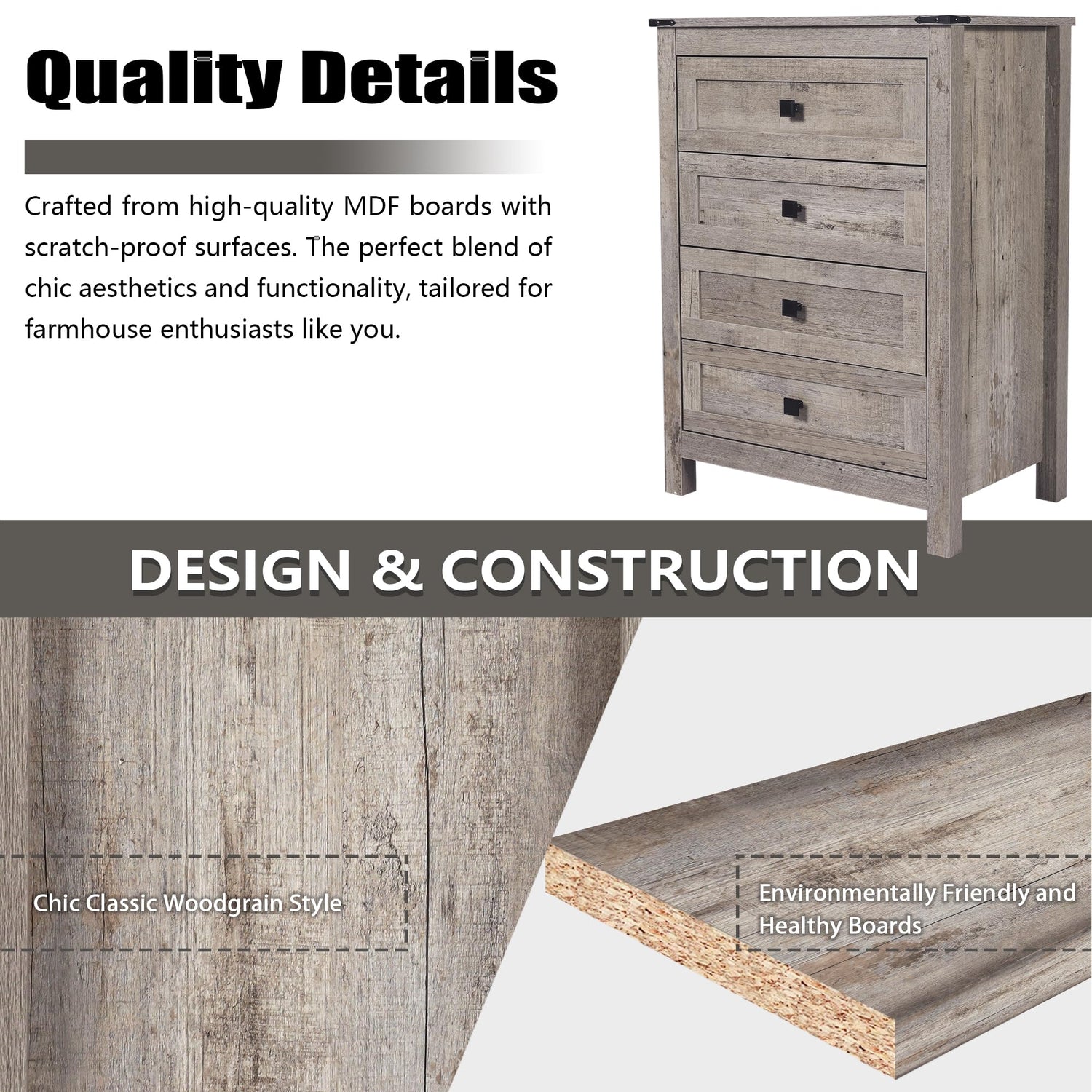 - Wooden Farmhouse 4 Drawers Dresser: Rustic wooden 4 drawer dresser with barn door style and spacious design is a perfect combination of modern and farmhouse style, adding character and charm to your bedroom and living room. Can be used for clothing organizer/lingerie dresser,entryway table, accent storage cabinet for living room.