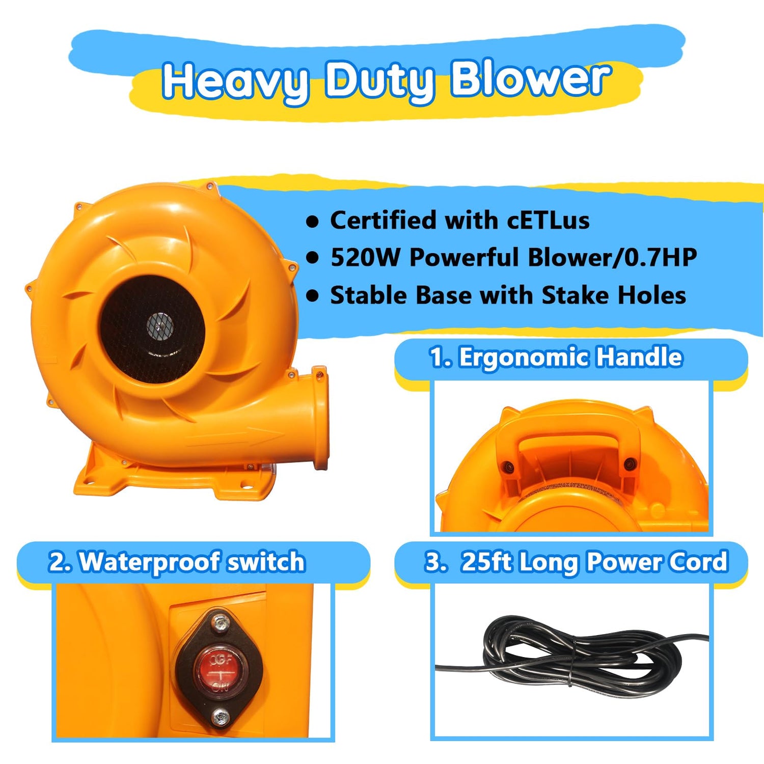 - SAFETY FOR KIDS-Manufactured with the high standard of quality non-toxic materials to ensure the safety and satisfaction of children. The jumping area made of durable composite PVC material to improve the strength and durability of the product. There are 3 sides of mesh safety net around the jumping area as well as side entrance with velcro design to protect your child from falling while jumping. The water cover button design and Blower with GFCI plug keep you and your child safe while playing