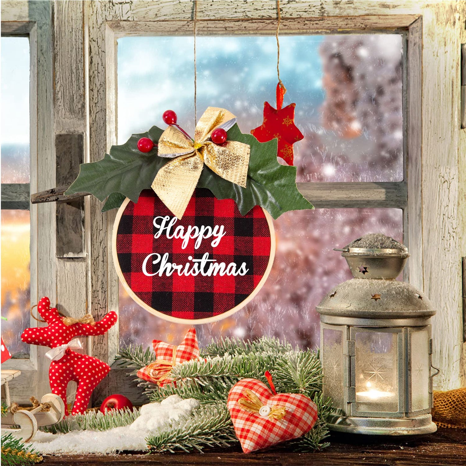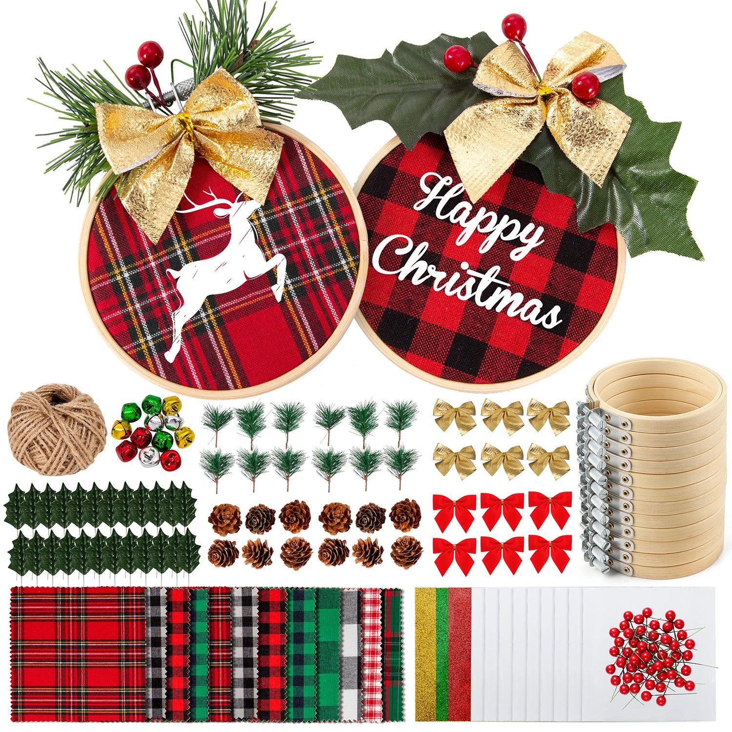- Value Christmas Ornament Crafts Kit: Package includes 12 x bamboo hoop, 12 x heat transfer vinyl, 12 x Christmas plaid fabric, 50 x artificial small berries, 12 x mini pine cones, 12 x artificial pine needle, 12 x bow, 24 x mistletoe, 1 x jute twine
