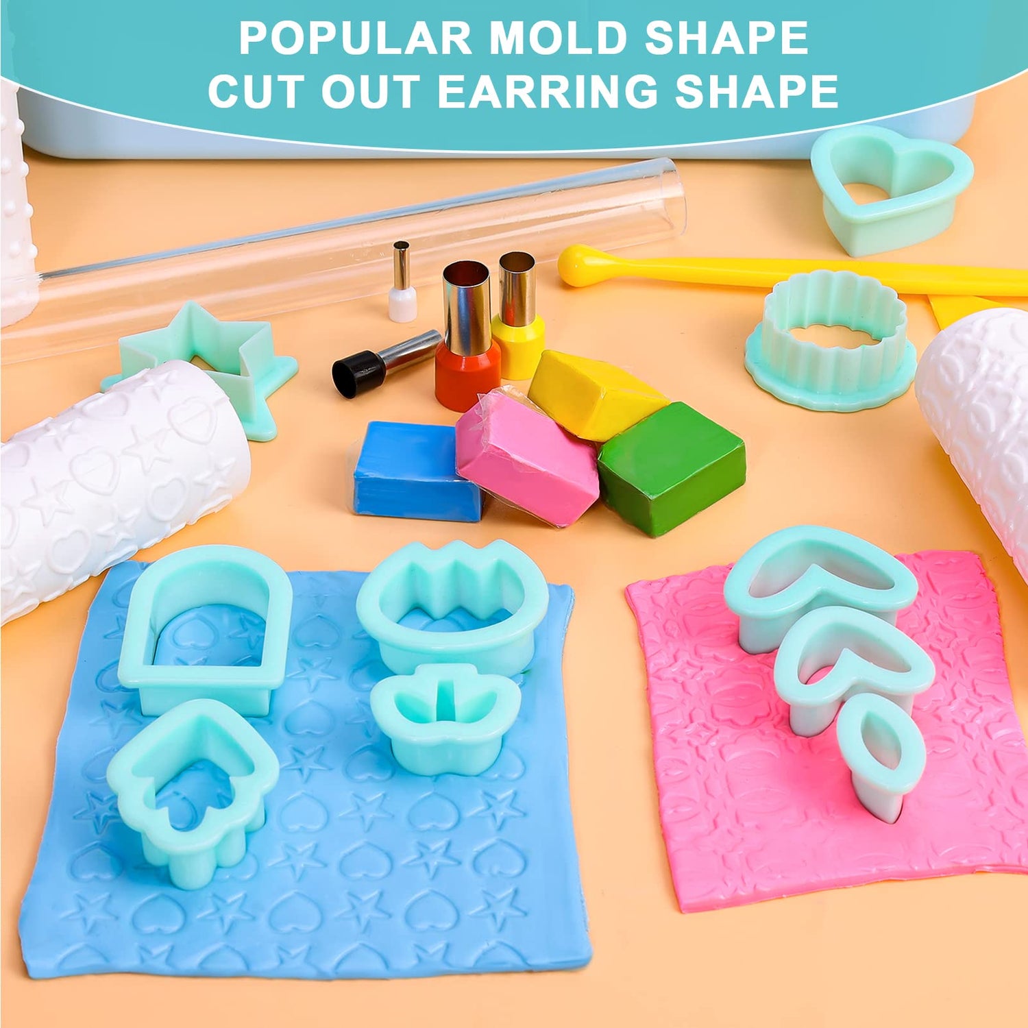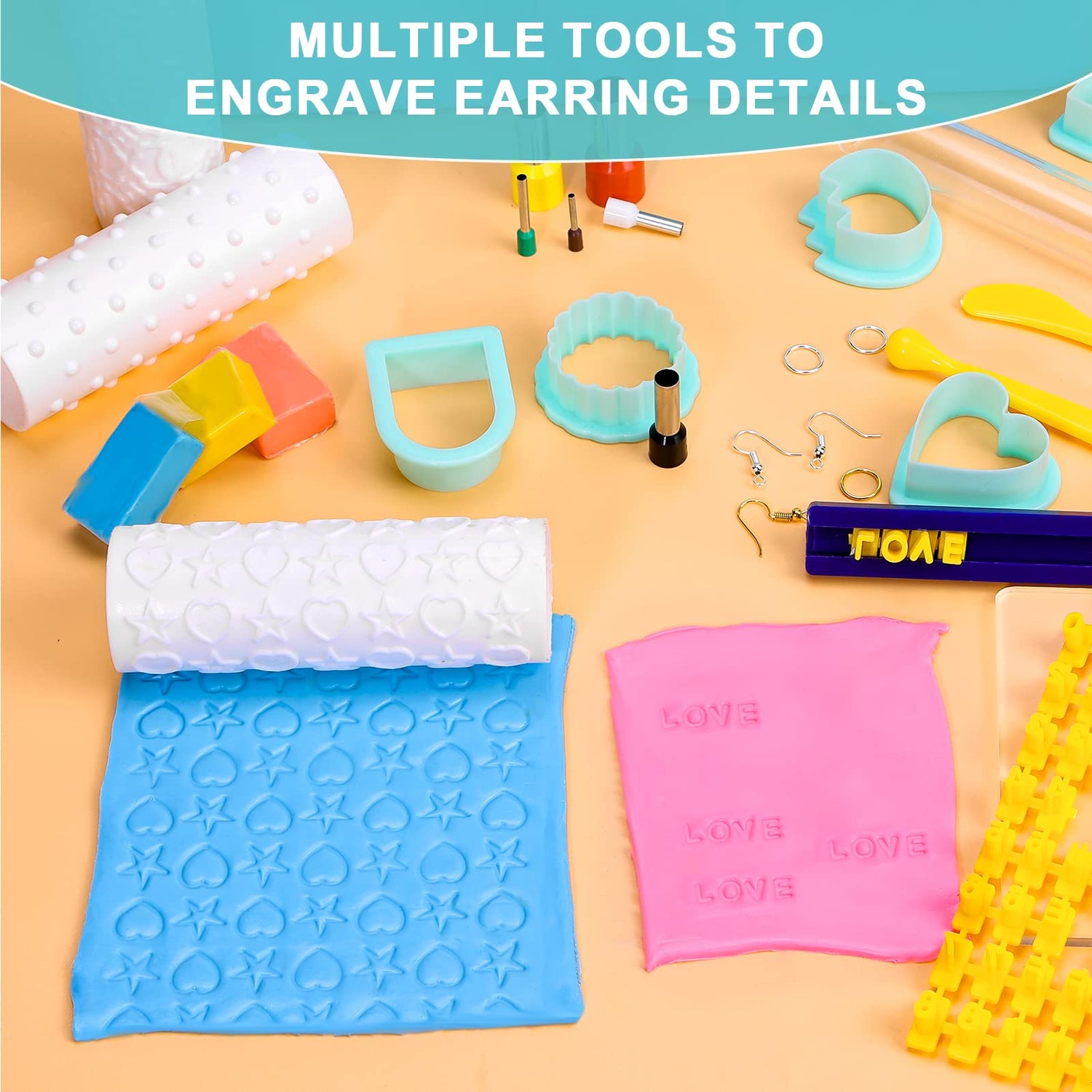 - 【Upgraded Clay Earring Set】Polymer clay earrings kit upgrade includes 44 different colors of polymer clay, 24 polymer clay earring cutters, 8 circle shape cutters, 90 earring accessories, 3 clay tools, 3 earring texture roller, an acrylic hollow roller, an acrylic sheet, plier, lettering stamp and instructions