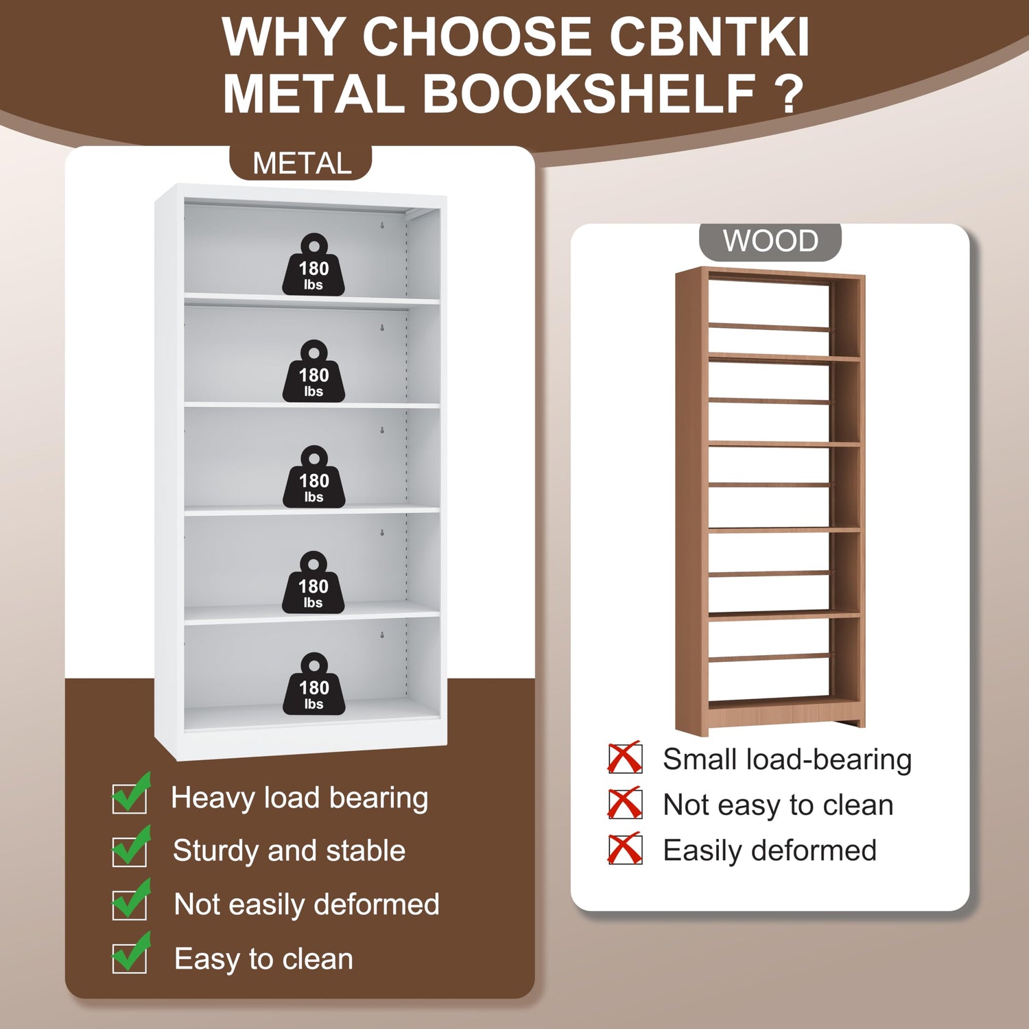 - ALL-METAL CONSTRUCTION: This white 5 shelf bookcase is made of heavy duty metal and has a super load-carrying capacity. The white metal bookcase can hold 180 pounds on each floor and can be used to store heavy objects. The thickened bearing base makes the bookshelves and bookcases more stable and reliable, and has a longer service life than ordinary wooden bookcases.