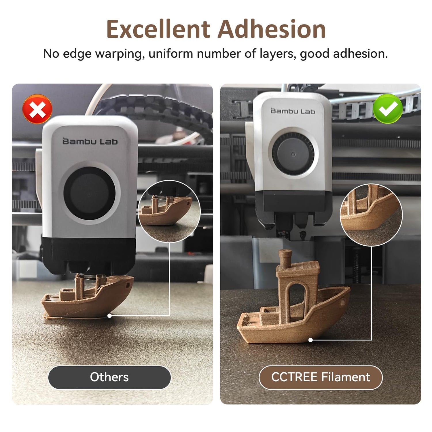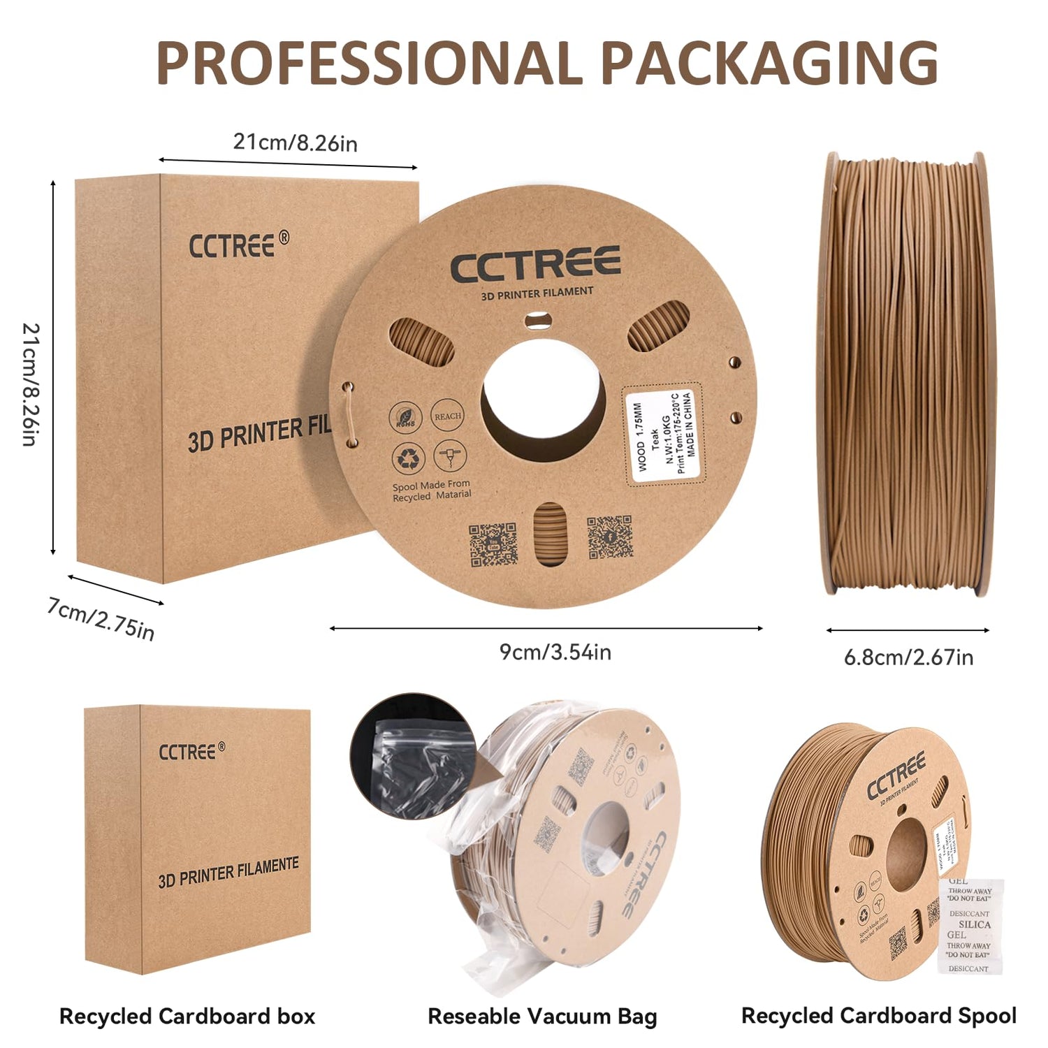 - 【WOOD PLA+ Filament】CCTREE wood PLA filaments add more real wood fibers than other wood PLA, making the printed models look like real woodwork. Wood Teak PLA shows a golden or medium brown color. It has the grainy appearance of woodwork: premium wood color and clear texture.