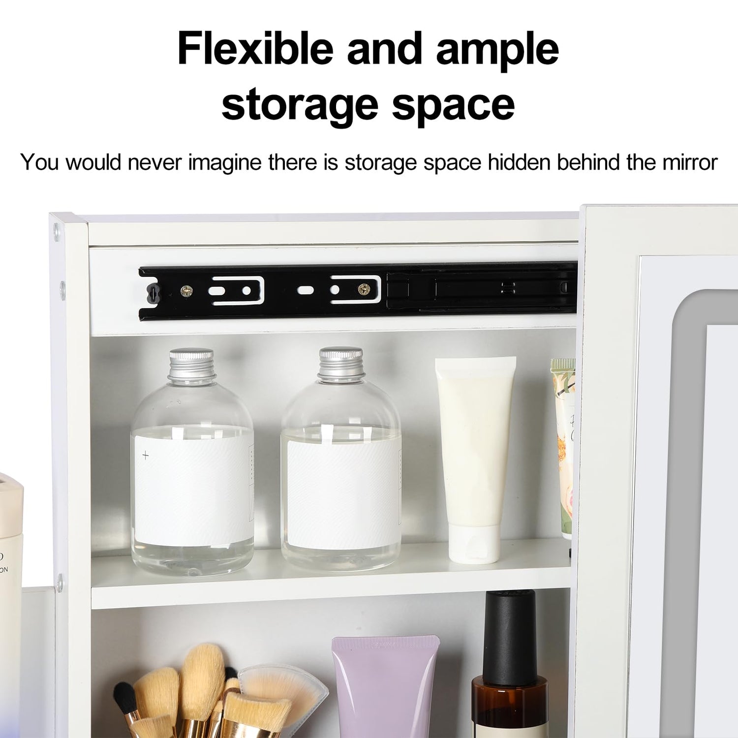 - 👑【AMPLE STORAGE SPACE】You can never imagine that there is hidden storage space behind the mirror. The vanity desk features 4 spacious drawers with wooden handles and a lock, allow you to store your jewelry and makeup stuff. The open shelves and hidden shelves provide plenty of storage space to display cosmetic, nail polish, etc.
