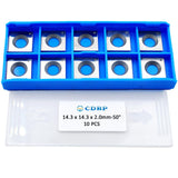 - Standard size: 14.3mm (.56”) square shape, 2mm (.08”) Thickness, 50° Cutting Angle, 2 Edges.