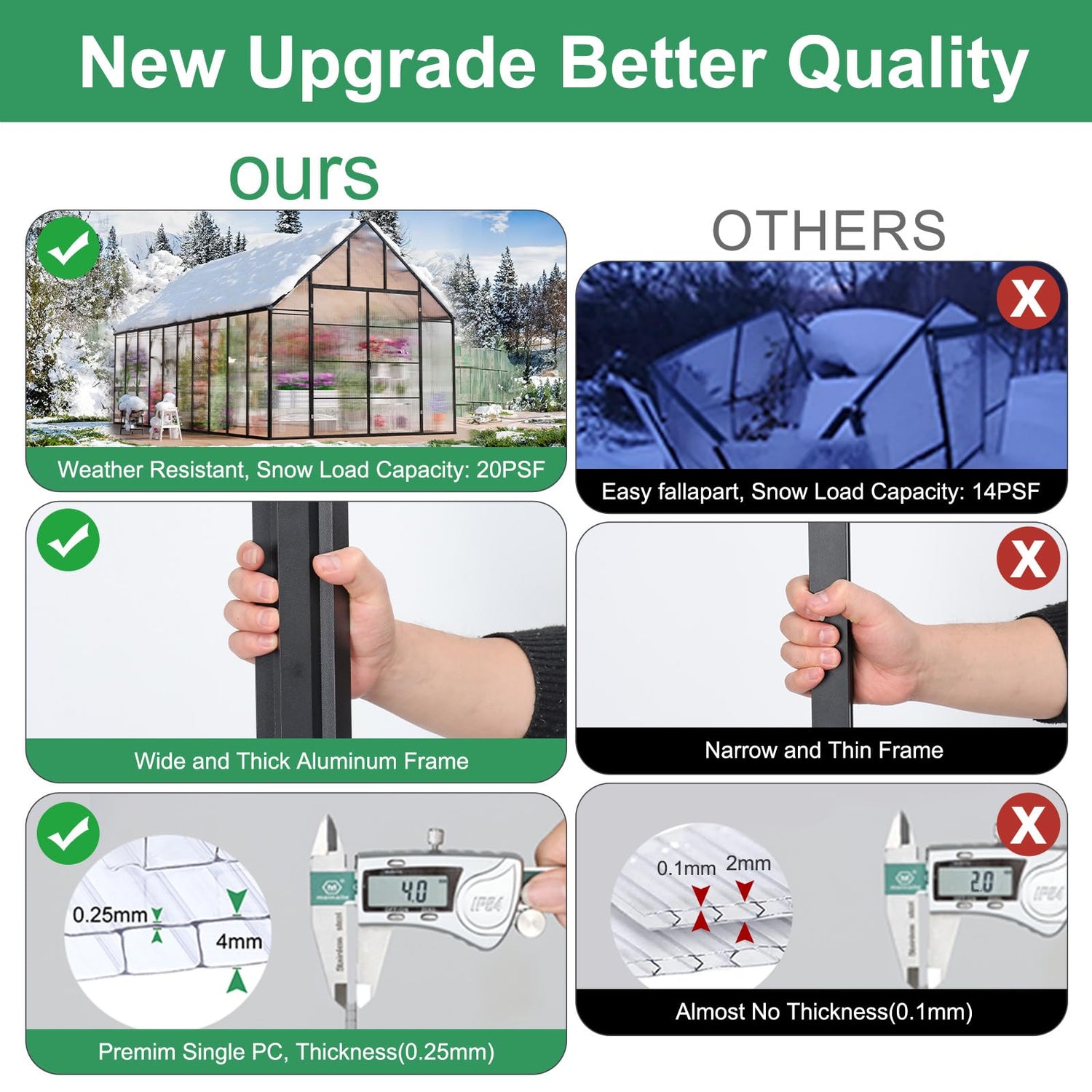 - Sturdy Frame: Our greenhouse kit boasts a robust rust-resistant aluminum frame designed to withstand various weather conditions. 2 skilled enthusiasts can assemble this greenhouse kit within just 4-6 hours. Introducing patented technology, Easy assembly, saving you 50% of your time. Gone are the days of tedious setups. With a simple push and locking screw, our Quick Connect ensures a reliable, secure, and swift link-up. It can also support snow loads of up to 20PSF.