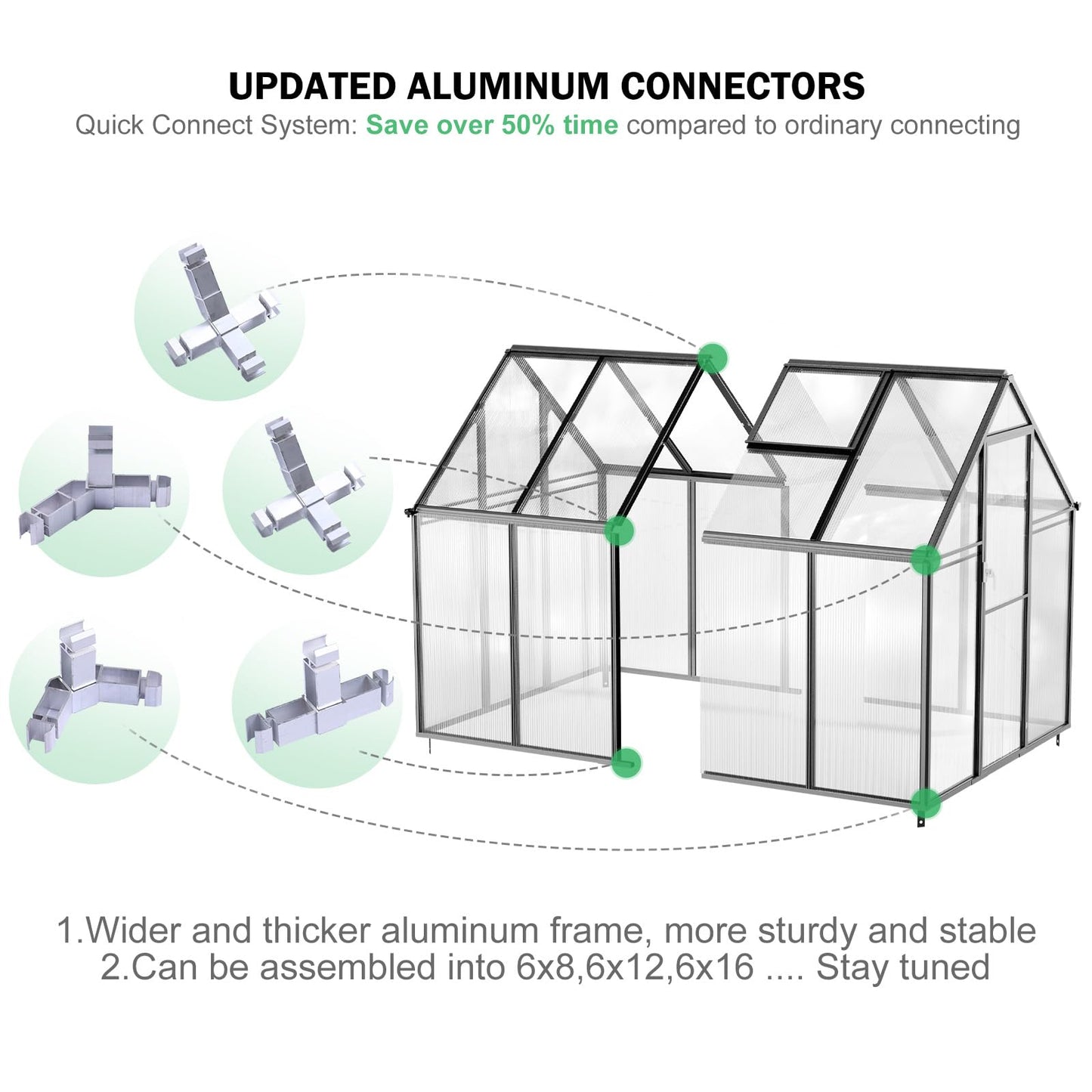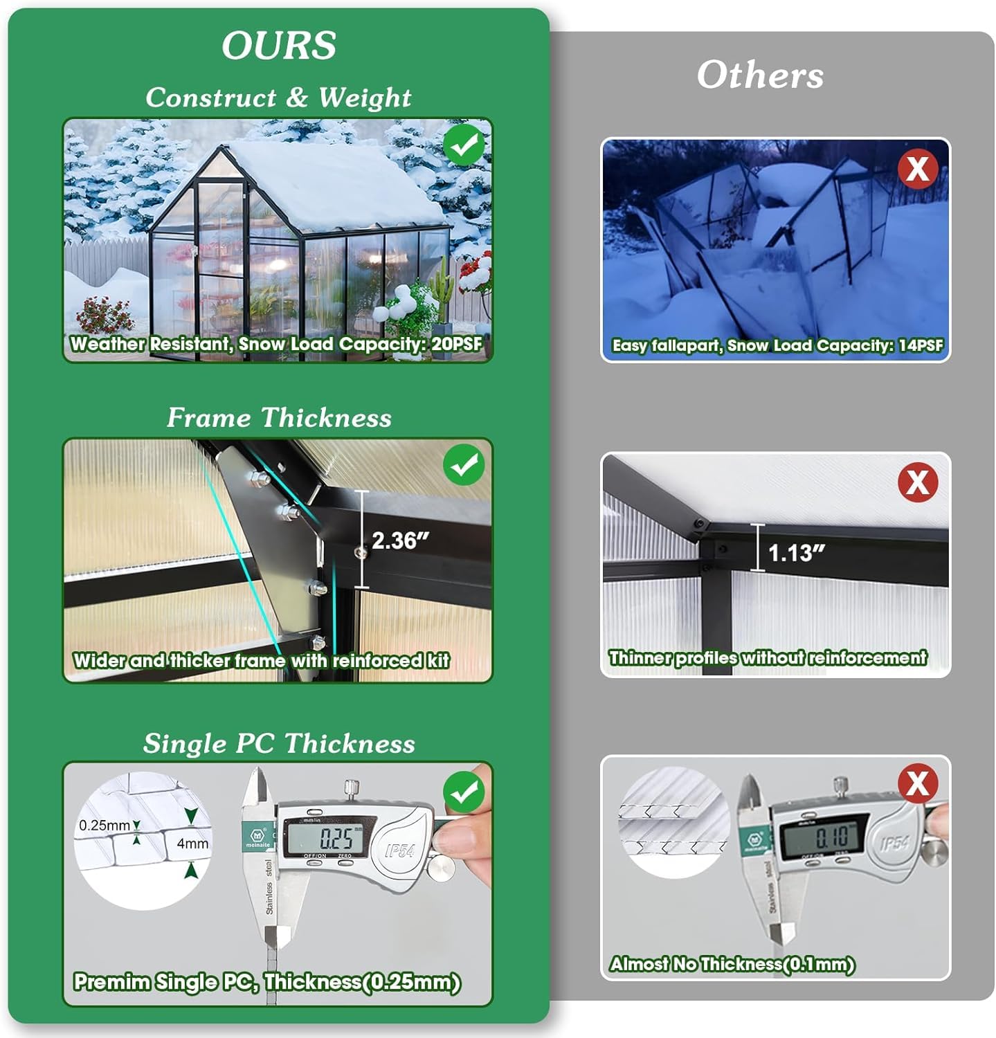 - 【Sturdy Frame】Our greenhouse kit boasts a robust rust-resistant aluminum frame designed to withstand various weather conditions. 2 skilled enthusiasts can assemble this greenhouse kit in just 4 hours. Introducing patented technology, Easy assembly, saving you 50% of your time. Gone are the days of tedious setups. With a simple push and locking screw, our Quick Connect ensures a reliable, secure, and swift link-up. It can also support snow loads of up to 20PSF.
