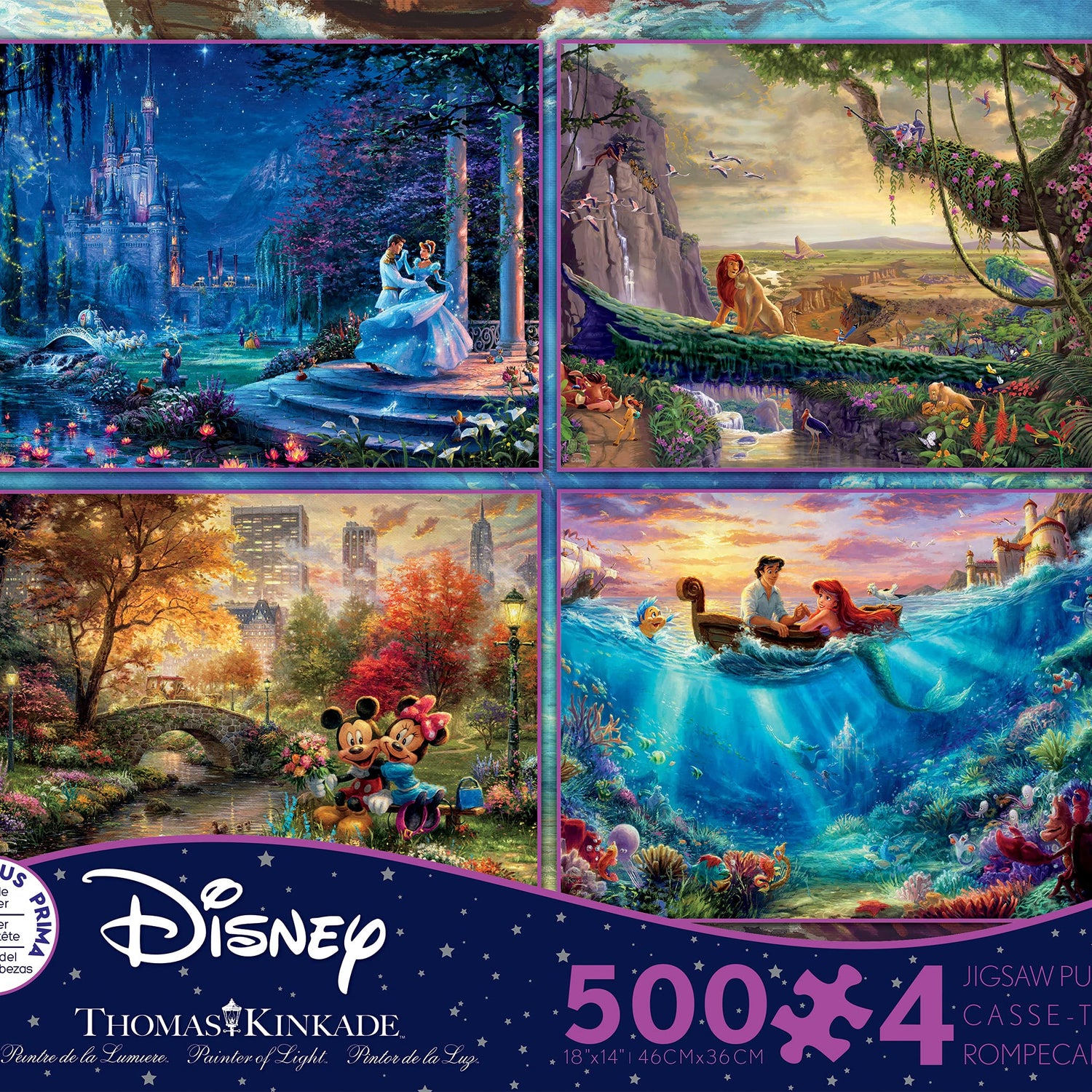 Details: This Disney Dreams multipack prizes (4) beautifully composed puzzle artwork by Thomas Kinkade featuring Cinderella, The Lion King, Mickey and Minnie Mouse, and The Little Mermaid. This is one of dozens of beautiful Thomas Kinkade Disney Collection (4) 500 piece puzzles available.