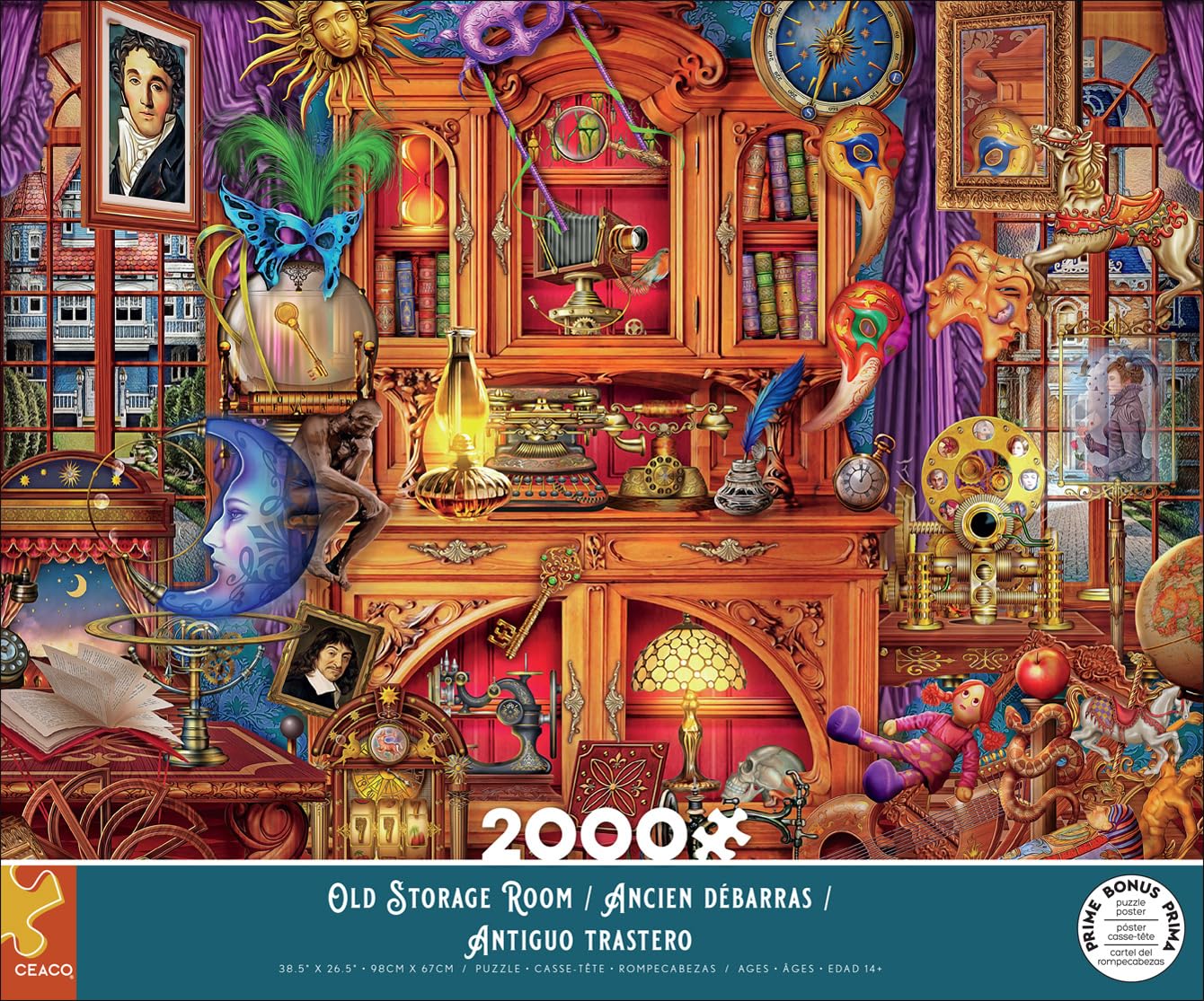 Details: This 2000 piece puzzle by Ceaco favorite Cirro Marchetti is titled "Old Storage Room". It features a colorful collection of toys, paintings, books and other items, many of them with a Sun and Moon motif. The finished dimensions of the puzzle are 38" x 26". A bonus poster is included with the puzzle. Count on Ceaco for the most Creative, Exciting, and Colorful puzzles since 1987.