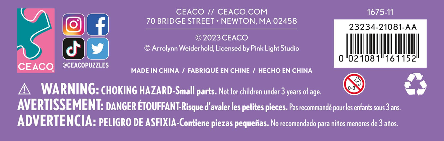 Details: Welcome to Ceaco! We are so grateful that you have found your “fit” here. Since our start in 1987 we have remained true to our mission: to create high quality, innovative and challenging jigsaw puzzles and to provide hours of family fun. We pride ourselves on developing and maintaining long standing relationships with some of the finest artists of our time. Our talented team of designers and marketing professionals are always searching the world over for developing trends, emerging artwork, and new technologies involving printing, die cutting, and unique puzzle materials. Our purpose is clear: to continue to be in the forefront of our industry and create a product that combines family entertainment with a distinctive aesthetic. Count on Ceaco for the most creative, exciting, and colorful products ever! Thanks and happy puzzling!